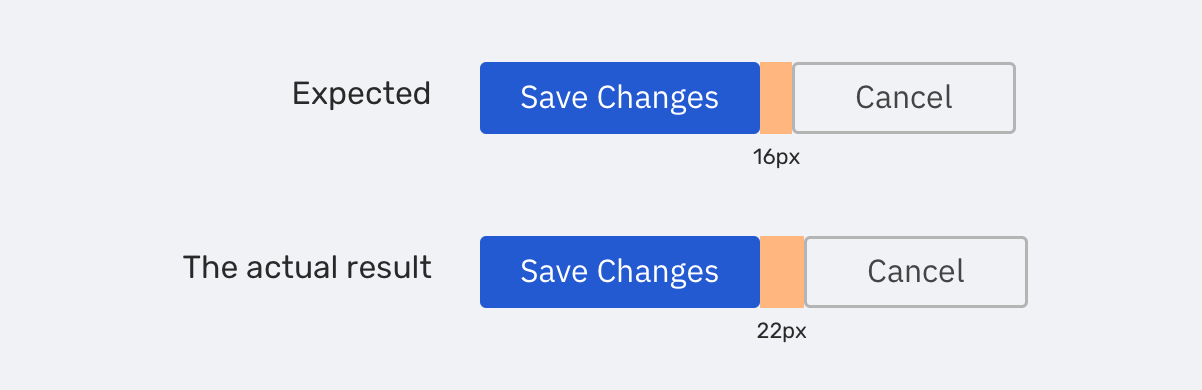 You’ve worked on implementing a website, and you got feedback from the lead designer saying that the spacing between the buttons is inconsistent. It’s 22px instead of 16px. When checking the CSS, it’s like the following: