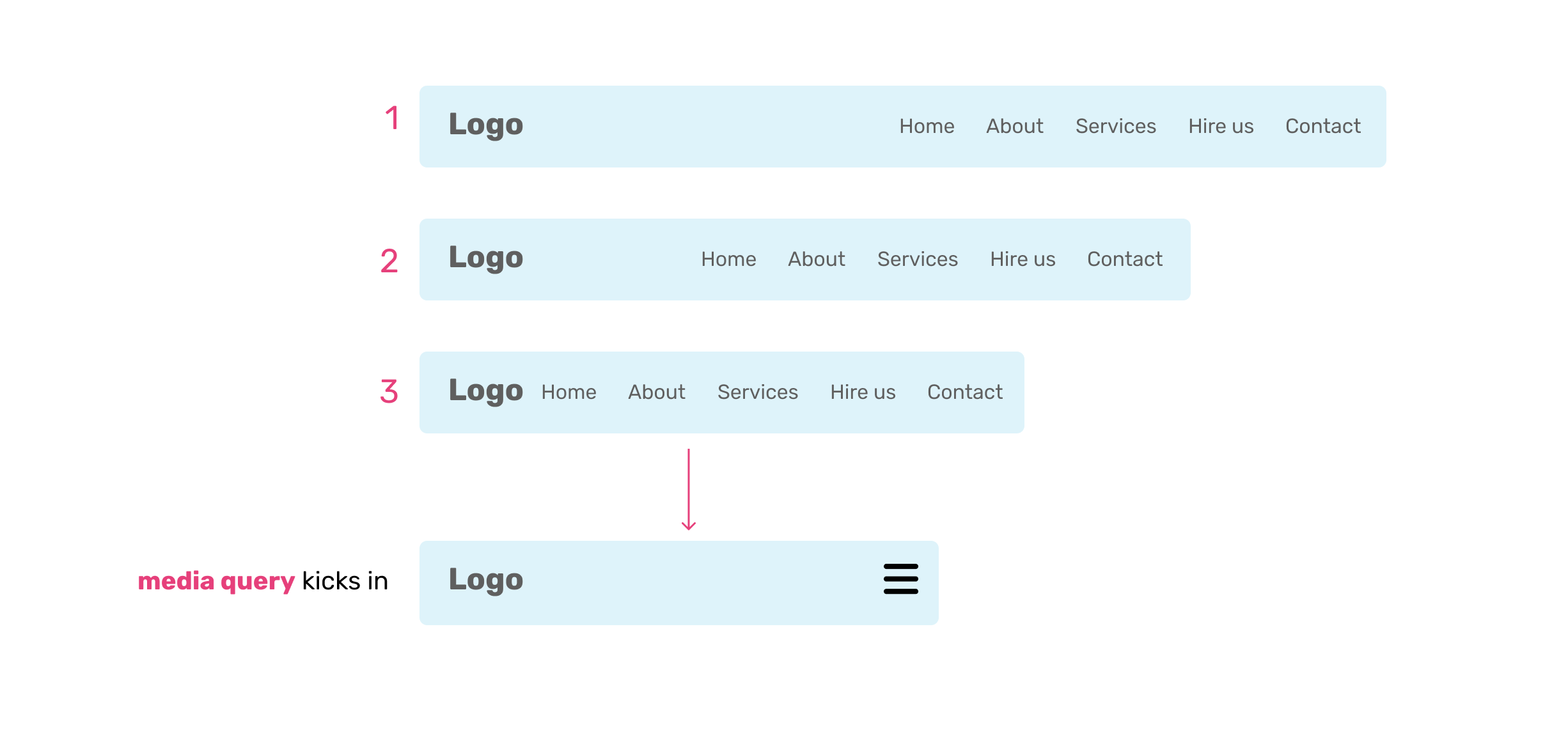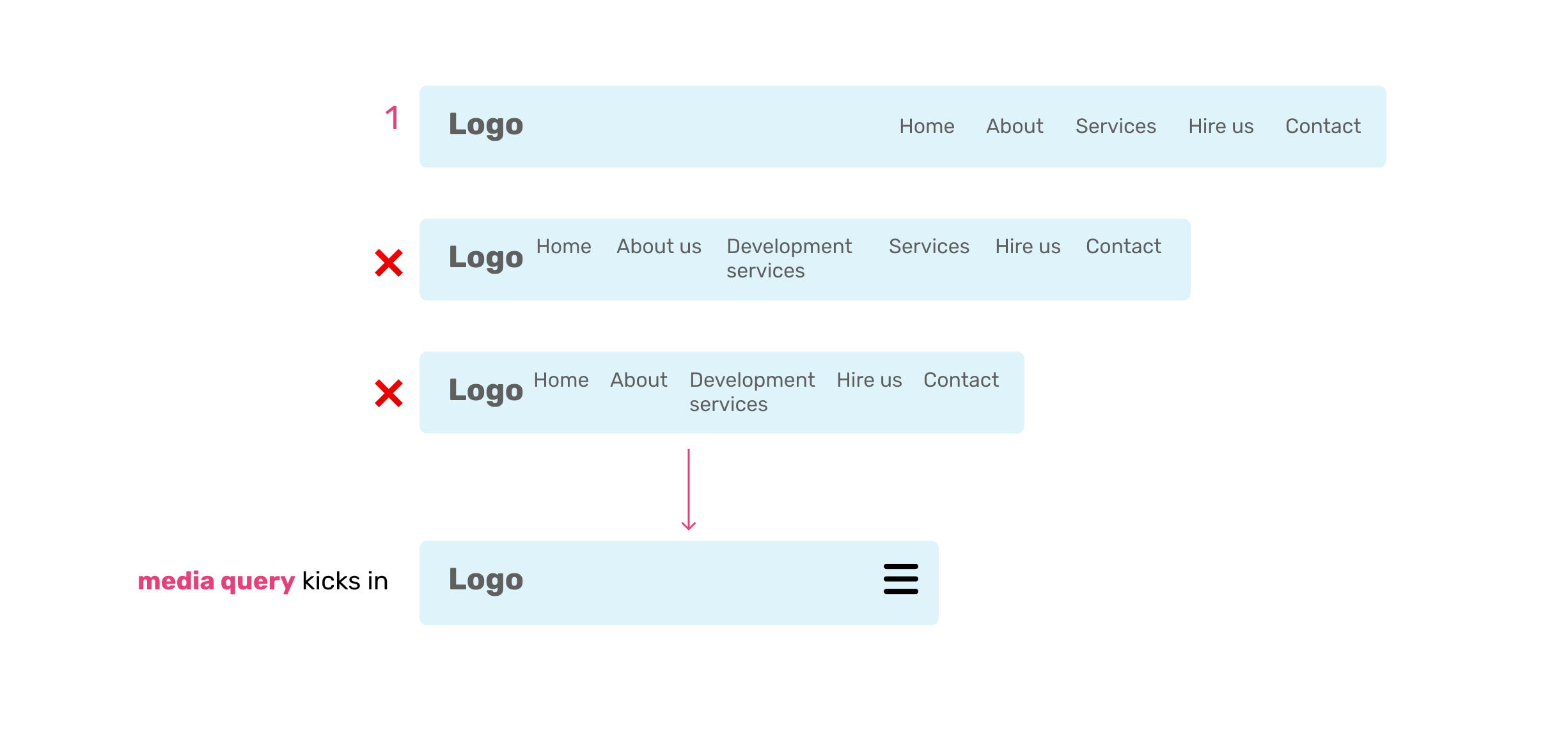 The media query won’t know that we have more navigation items, thus the need to kick in. It works based on the viewport width, not our content.