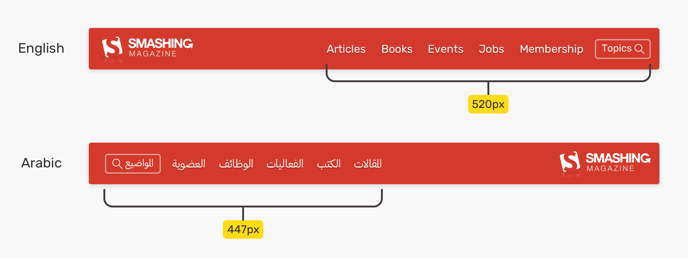 When working on a multilingual website, the same navigation items for English might look different in length compared to Arabic, for example.