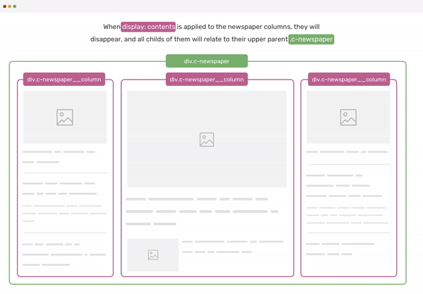 To make it more clear, I made the below GIF that shows the effect of applying display: contents to each of .c-newspaper__column containers.