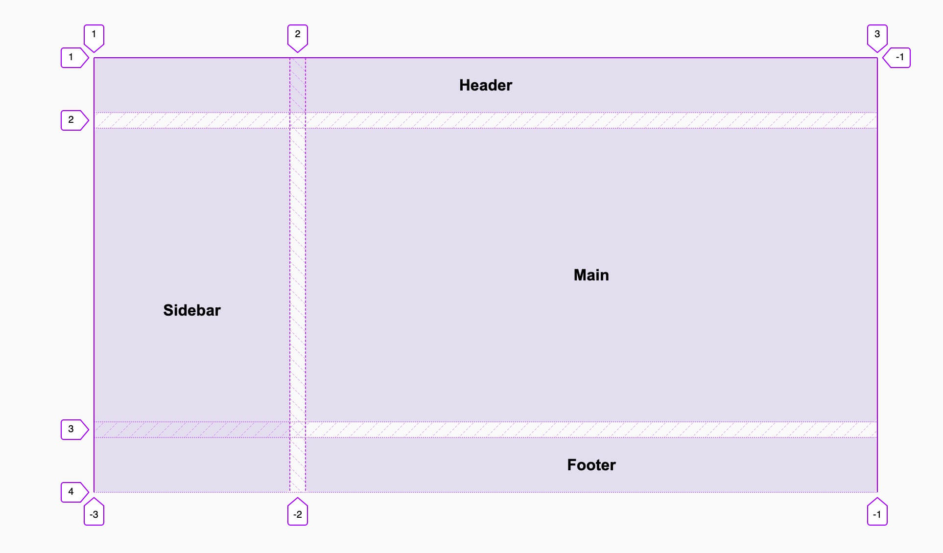Usually, I set a grid-column for each element of the header, sidebar, main, and footer like this: