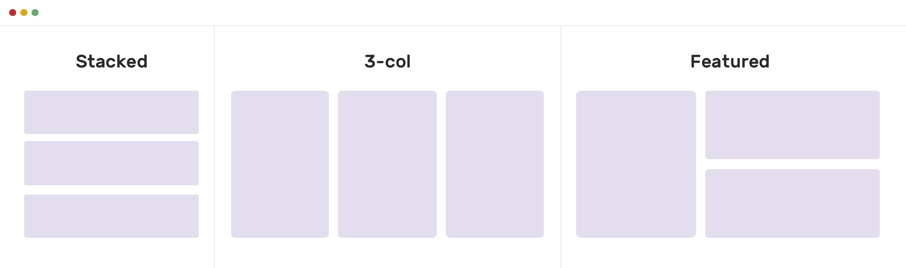 We have a section with a featured article that spans the height of two rows. To accomplish that, we will need three columns and two rows. Here is the HTML structure: