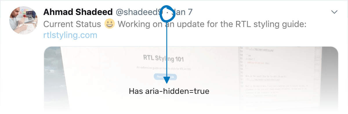 The dot between the user handle and the date is decorative. As a result, it has aria-hidden="true" to avoid announcing “dot” for screen readers.