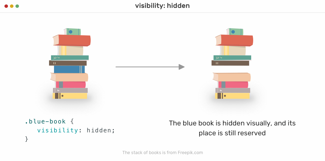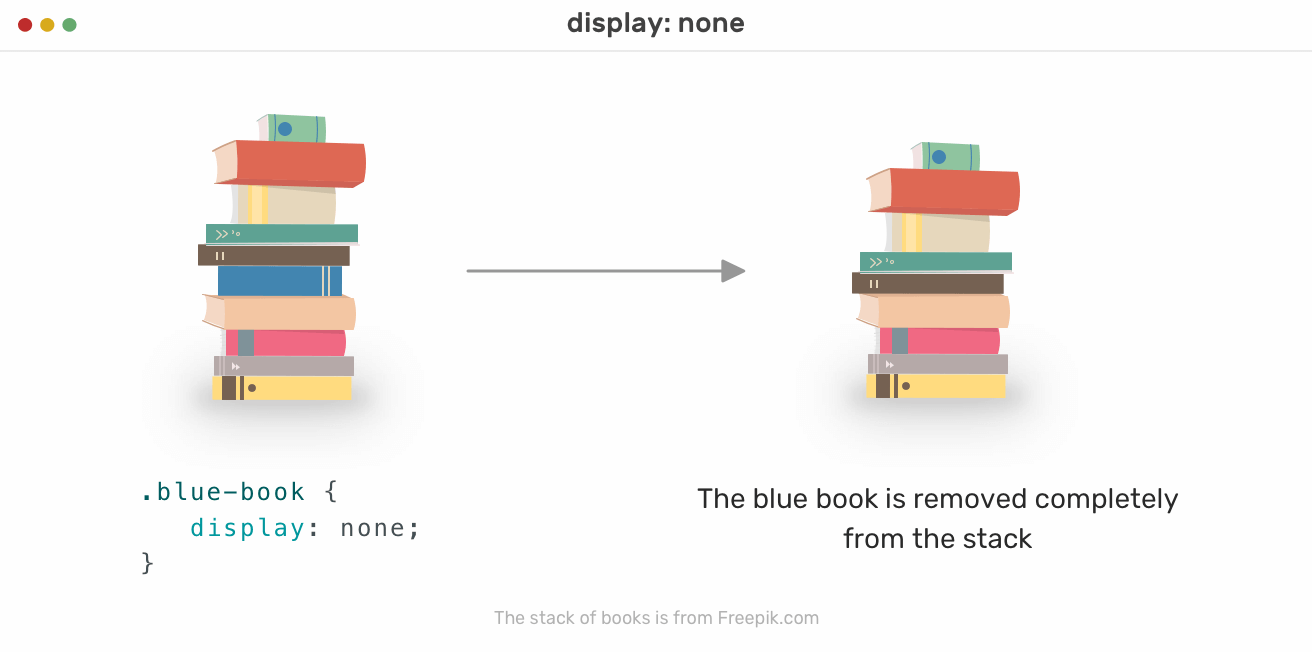Notice when the blue book is hidden, it has been removed completely from the stack. The space that was preserved for it is gone. The same concept applies when hiding elements in the HTML. The reserved space for the element is gone, and it changes the document flow, or in our example, the stack of books flow.