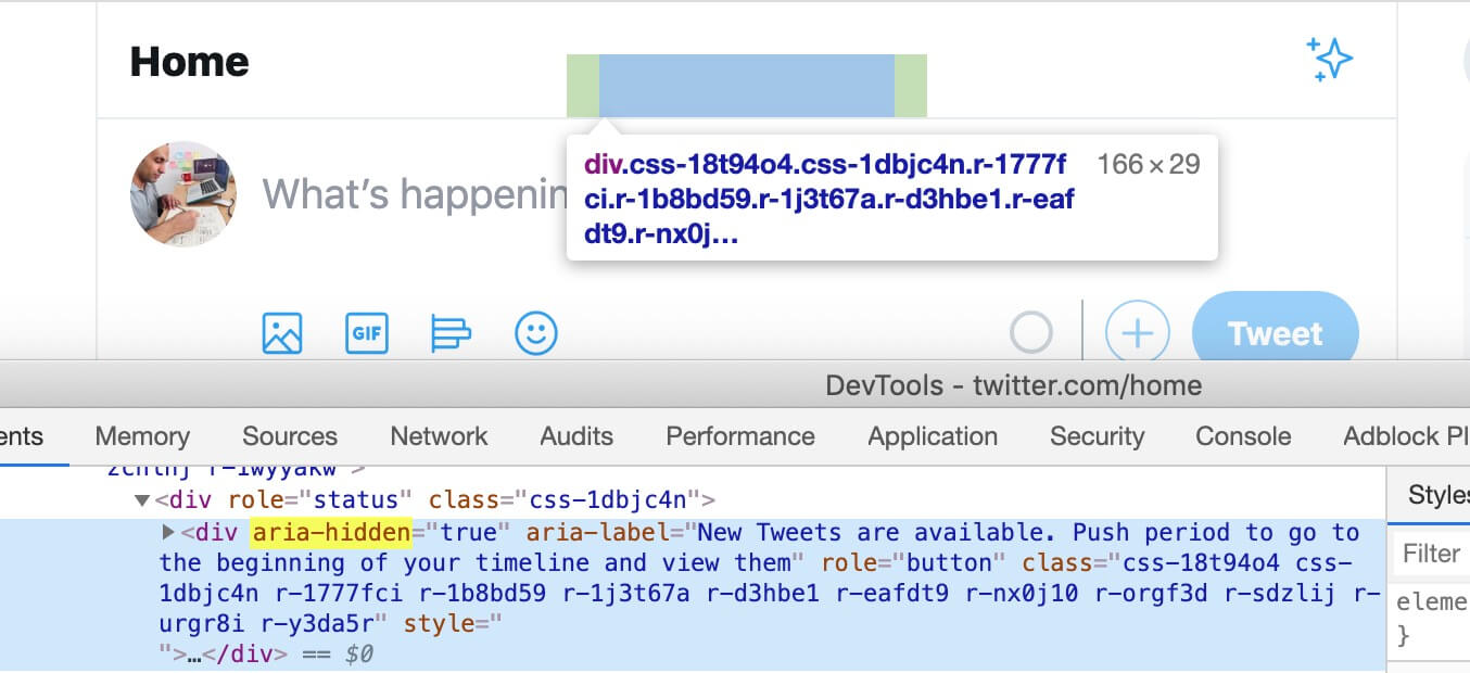 On Twitter, there is a button labeled “See New Tweets” that is hidden for screen readers with aria-hidden, and is shown only visually when new tweets are available.