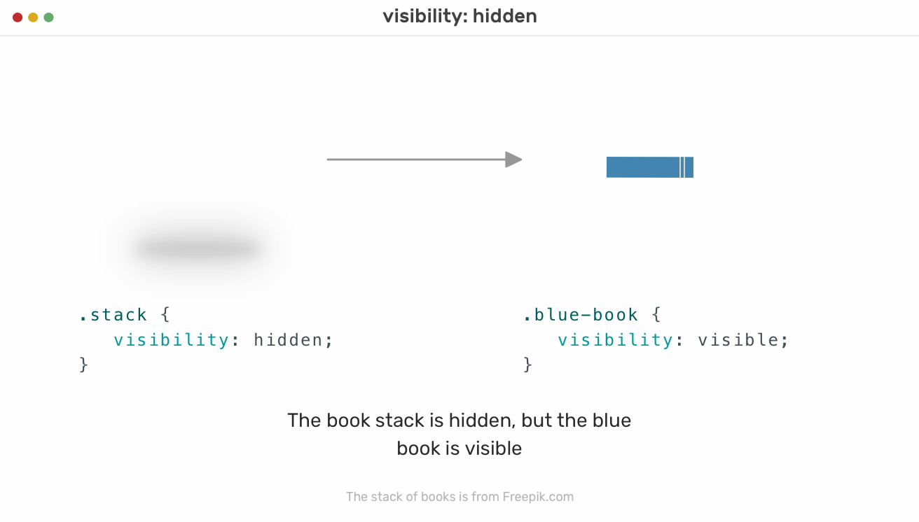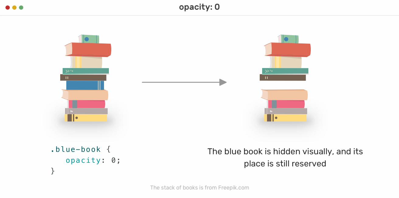 In the figure above, the blue book is hidden visually only. Its space is still reserved for it, and the stack order didn’t change, compared to what happened when we used display: none.