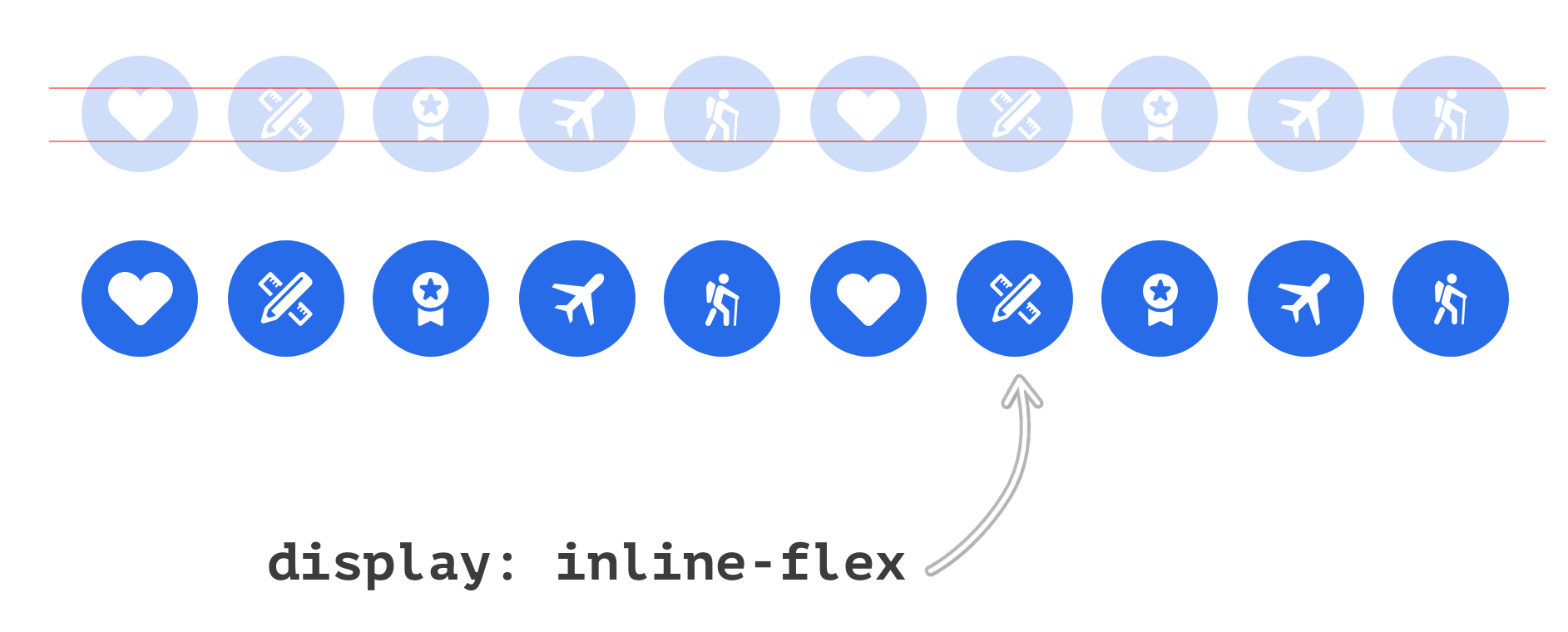 Each badge has its own icon that is centered horizontally and vertically. The centering of them is happening because of Flexbox, and all badges are inline since they have display: inline-flex.