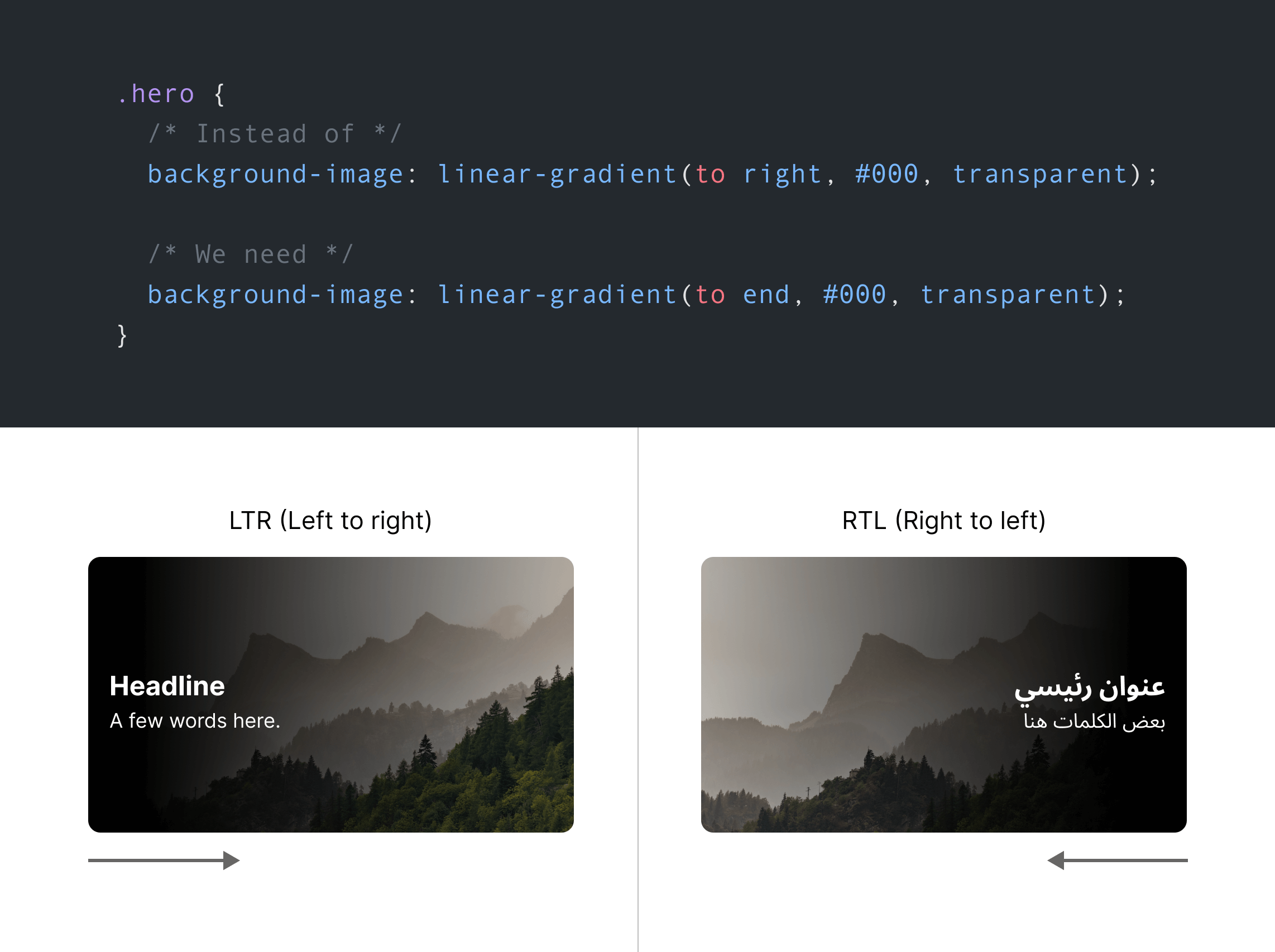 To make the hero work as expected on right to left documents (e.g: Arabic), the gradient should be flipped too. While thinking about this, I tweeted about an idea to bring CSS logical properties to gradients.