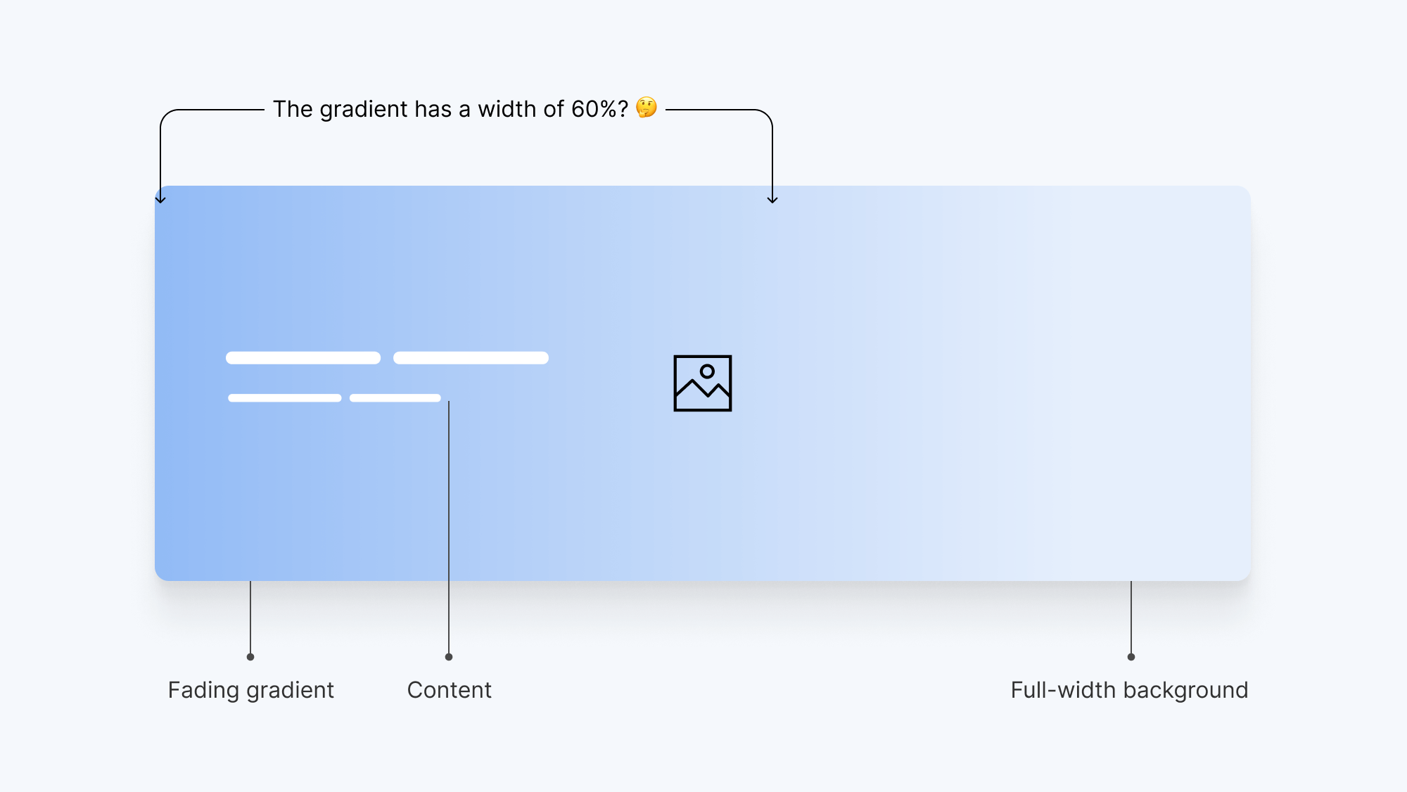 The content and image are straightforward here. The tricky thing that got me to think is the gradient. Should this be a gradient background to the content wrapper? Or maybe a separate element (pseudo-element or a <div>)?