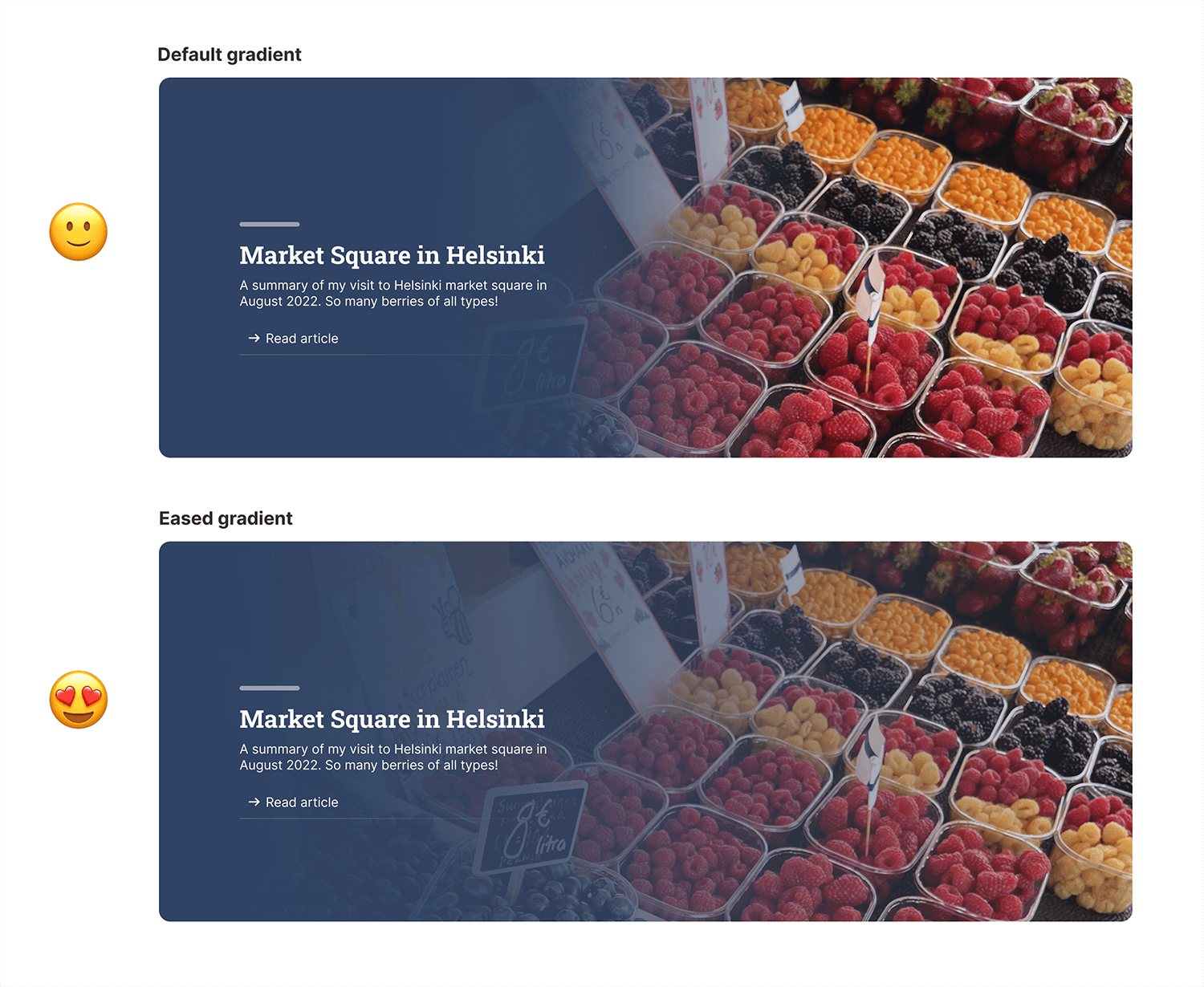How should that look on mobile? Should the gradient fade from the bottom to the top? Or maybe we need a solid color instead? What if this component needs to have different variations on mobile based on where it’s being used?