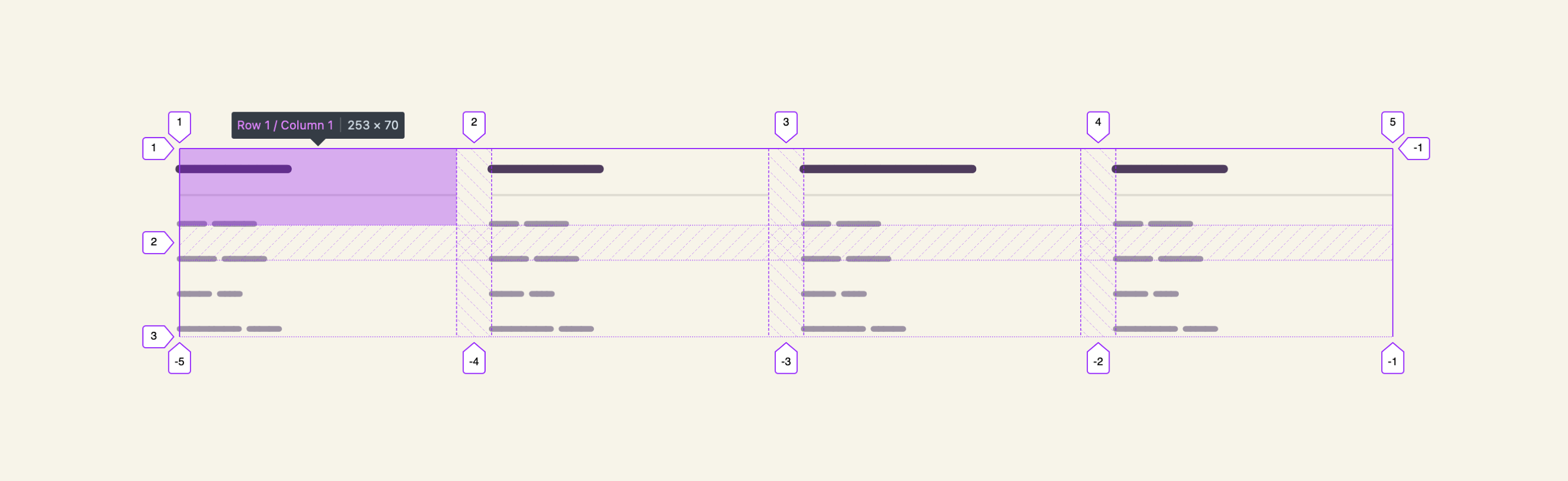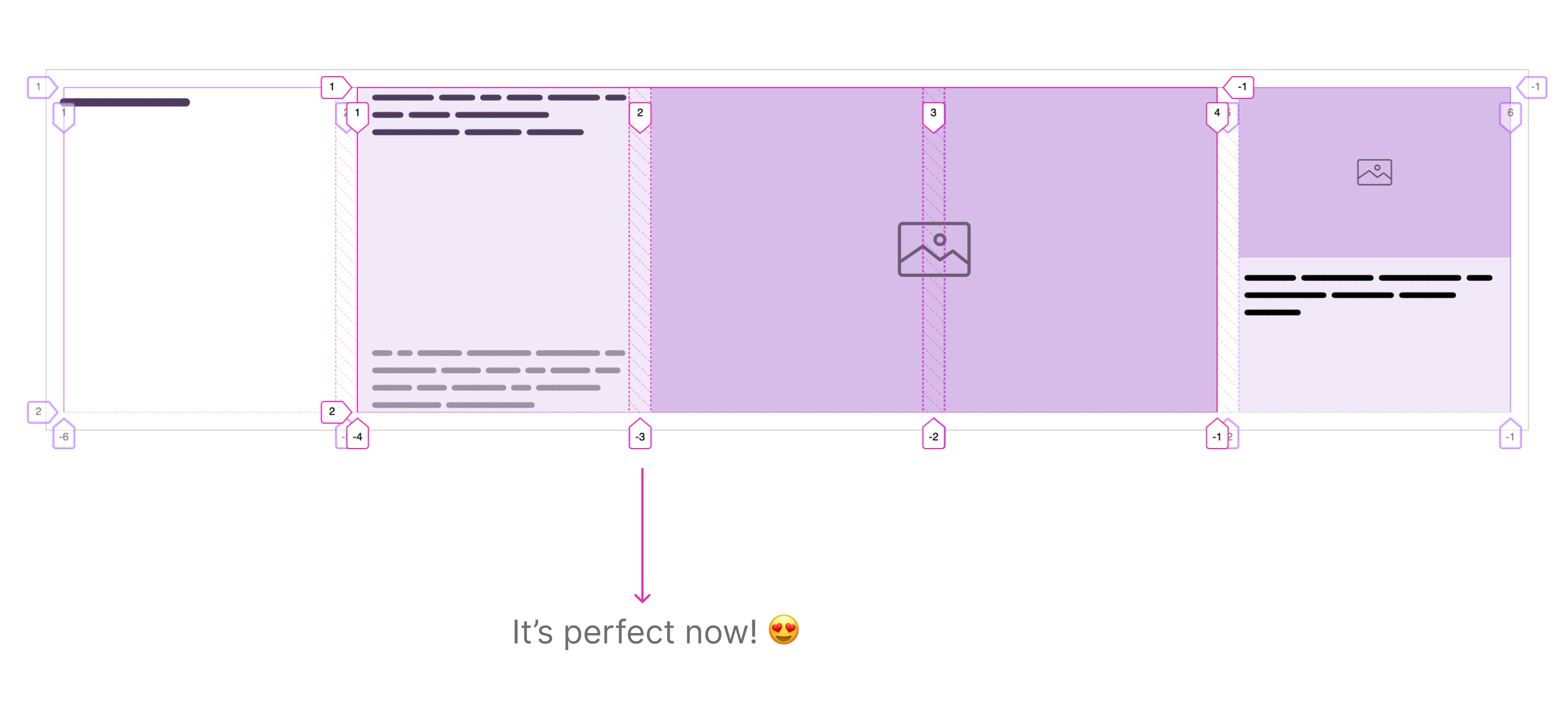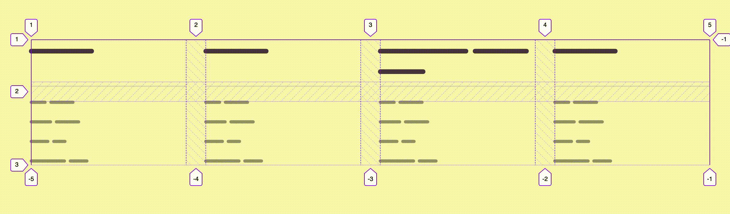 First, I needed a way to position the fake grid under the content. Thankfully, with CSS grid, we don’t need absolute positioning for that. By using 1 / -1 for both columns and rows, we’re telling the browser to make the fake grid take the full width and height of the parent.