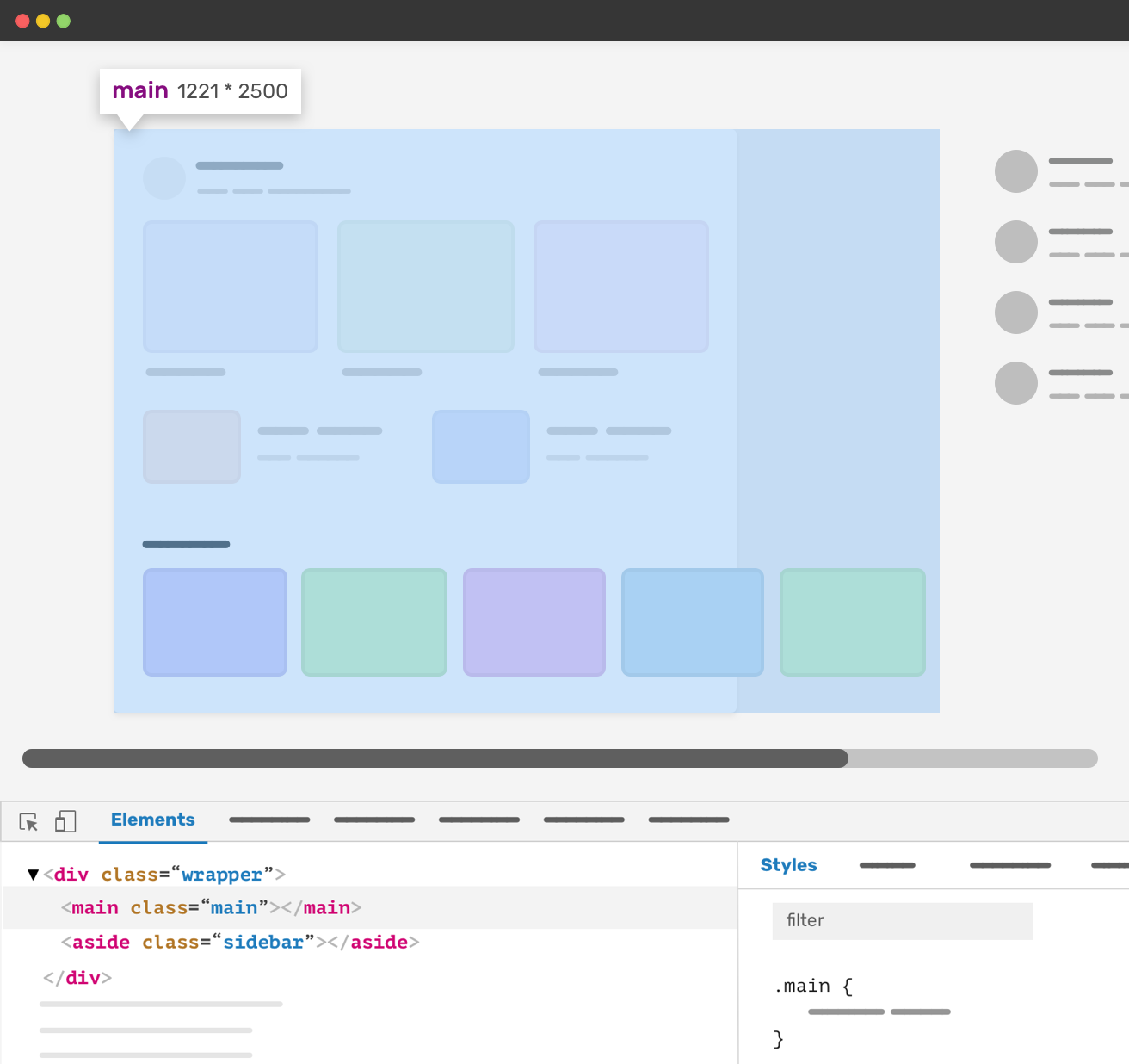 I opened the browser DevTools to inspect the main section, and I noticed that its width is so big. The main section width expanded due to the scrolling container.