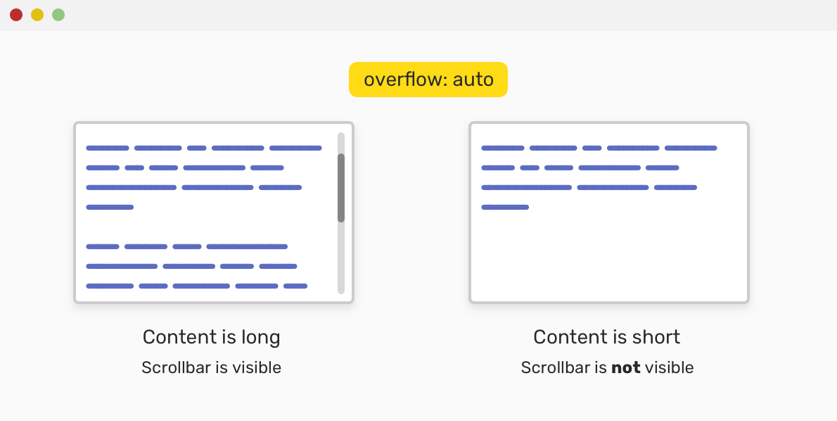 Notice that in the figure, the scrollbar is only visible in case the content is longer than its container. Next, we will go through the longhand properties that are related to overflow.
