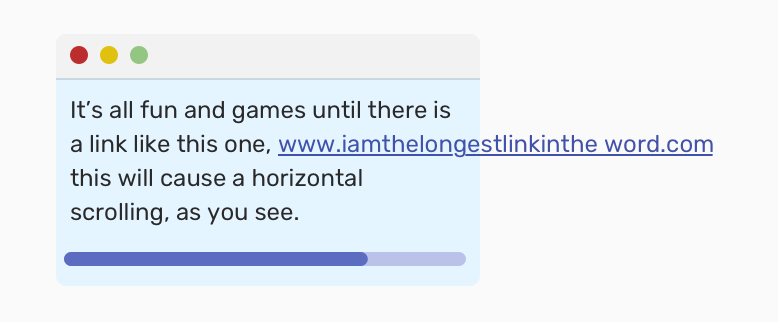 When dealing with long words or links that are placed within content, it should break to a new line or otherwise, you guessed it! There will be a horizontal scrolling.