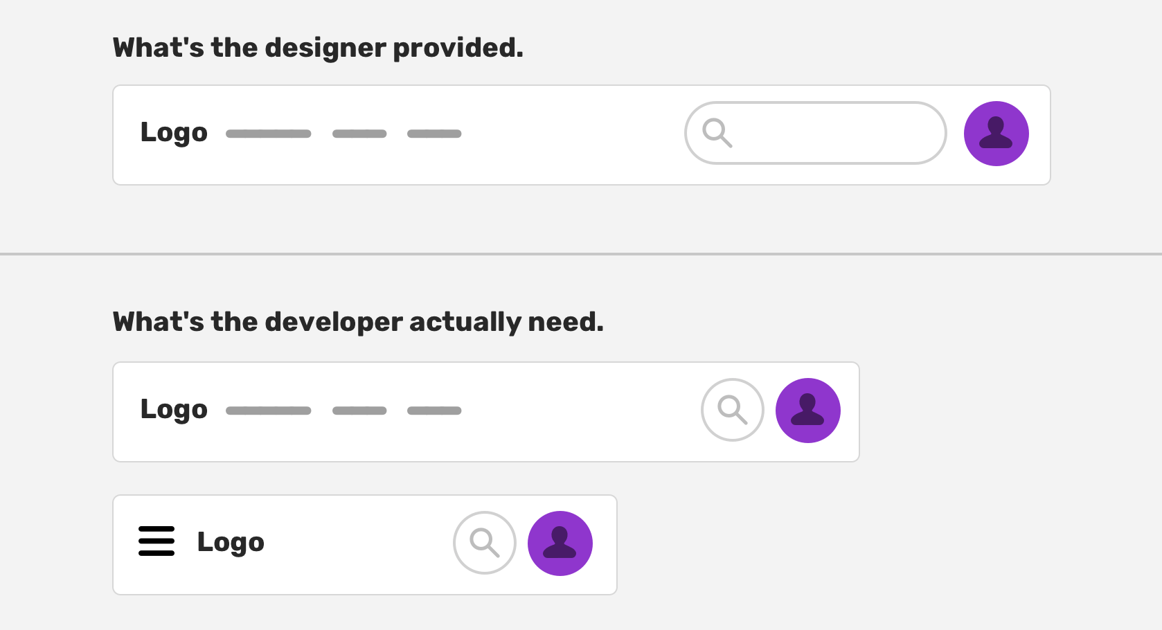 A component could have many states. The developer needs them all, while you might only work on one version. A good example of this is a website header. The designer provided the mobile and desktop version of it, and he thought that this is enough.