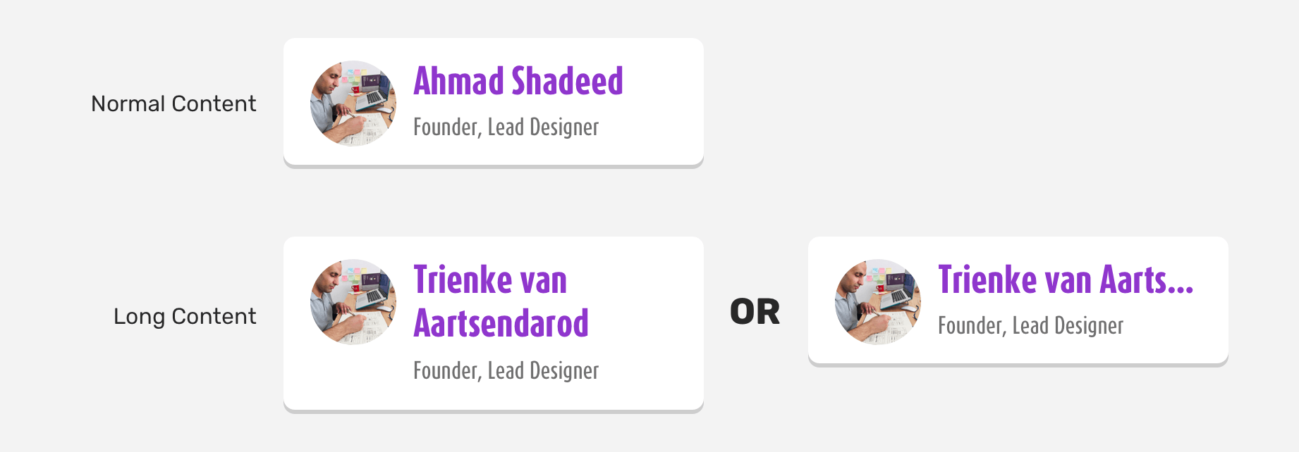 In the example above, the person’s name is long. How the design should handle that? Should it wrap into a new line or truncate the text? Providing such decisions ahead of time can help.