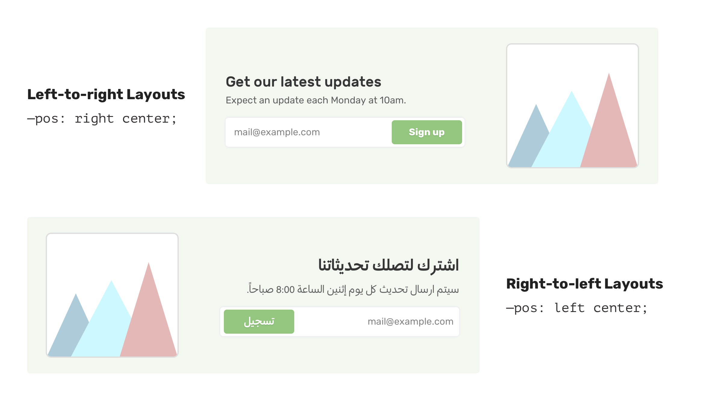 In the previous example, the background image is placed on the right side. For a right-to-left layout (RTL), the background position should be flipped.