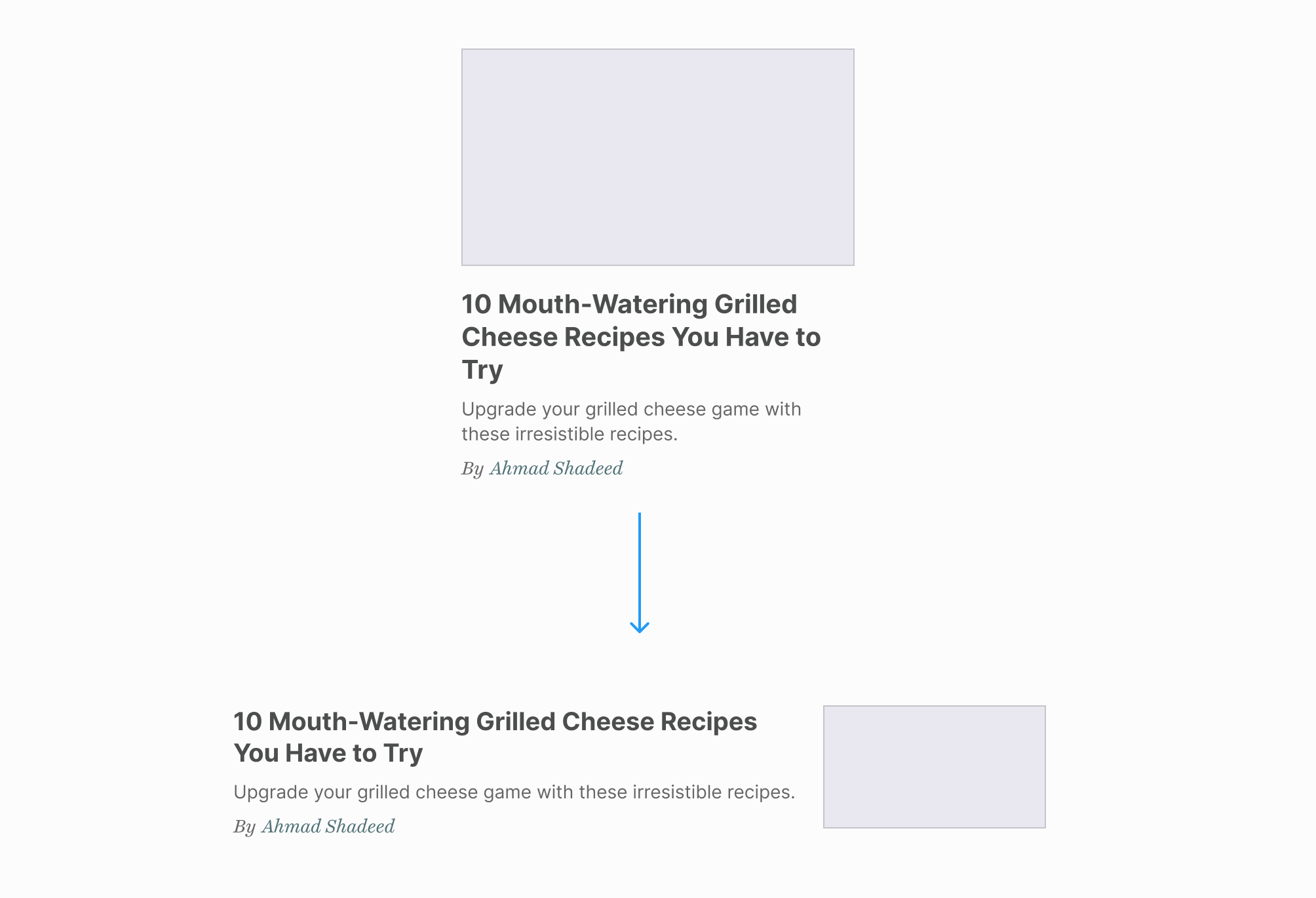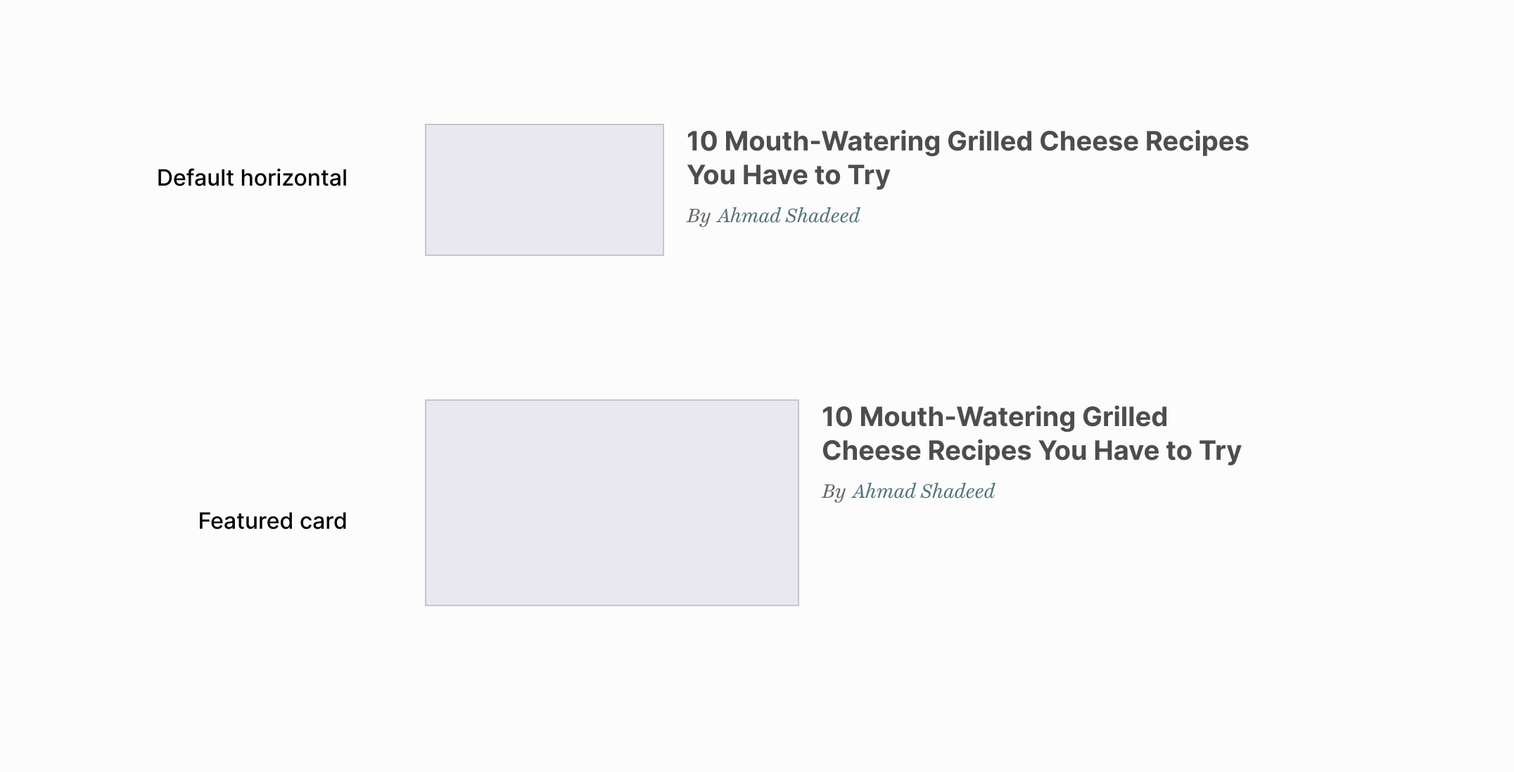 The featured card is displayed horizontally when the container width is small and will change to the stacked styles on larger sizes. In this case, the thumbnail becomes larger and takes 50% of the width.