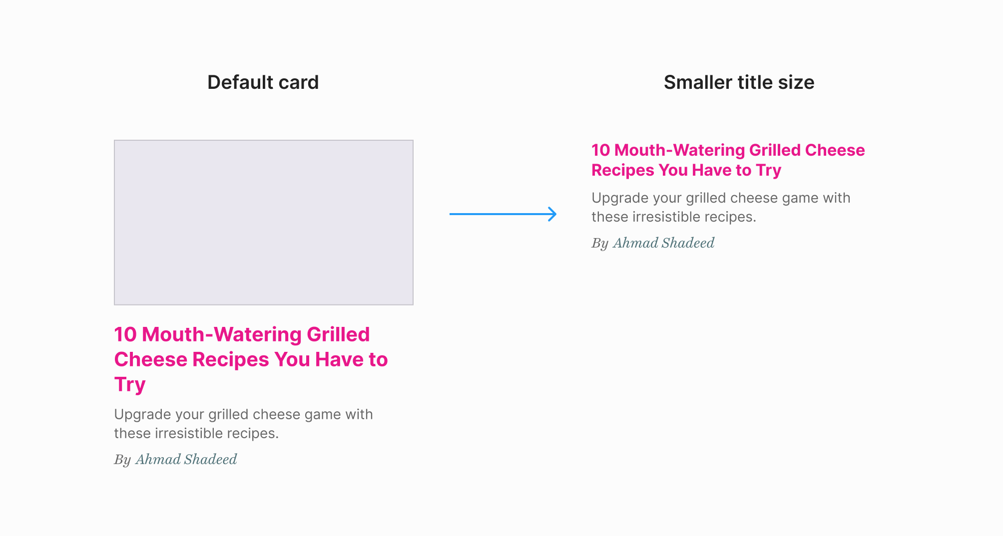 In this variation, the font size gets smaller. That happens when the image is hidden. At first, I thought about using CSS :has to check if the card thumb is displayed or not.