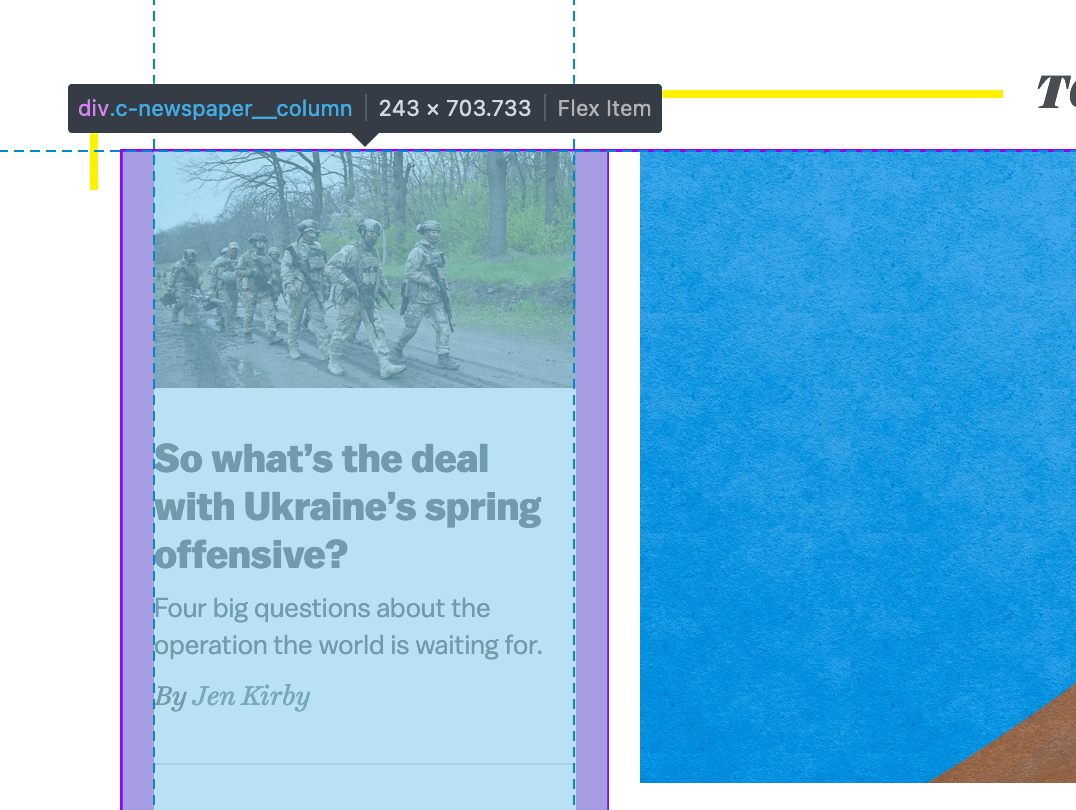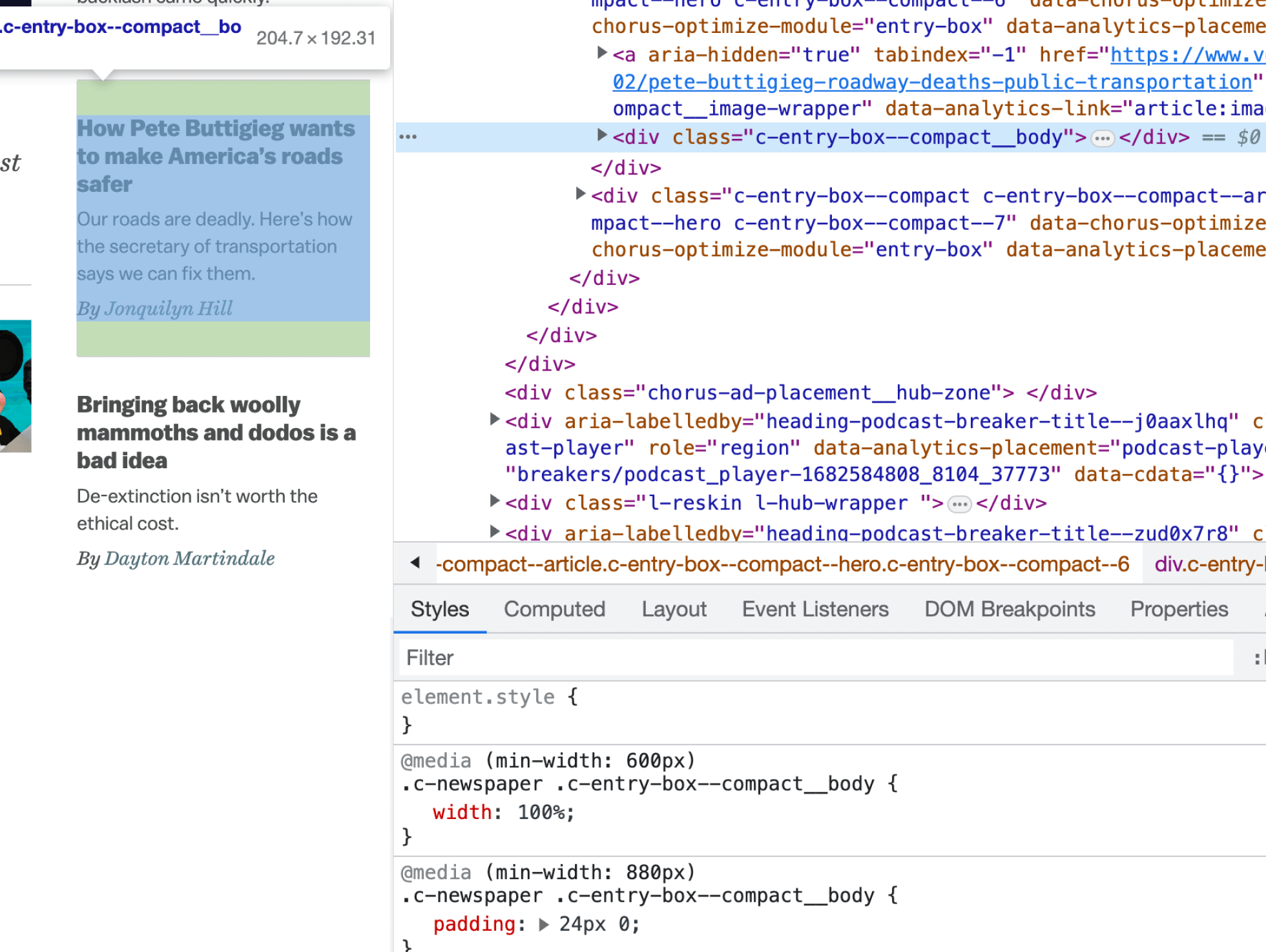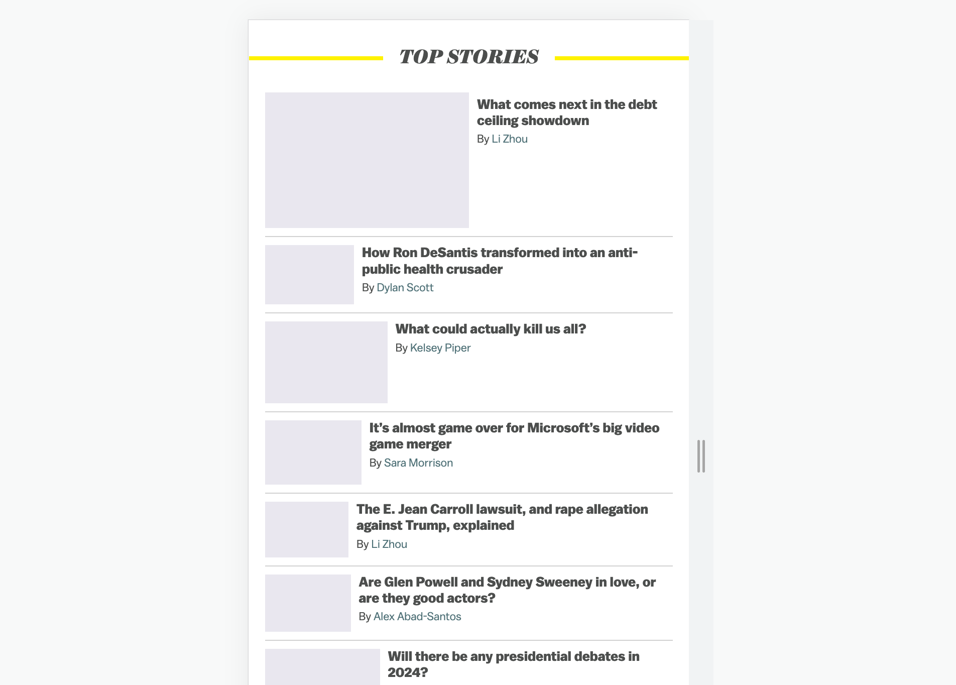 In vox.com, CSS flexbox is being used to handle the layout. I’m not a fan of using flexbox for such a purpose as this feels more like a CSS grid use case. I believe the Vox team used flexbox since it was better supported at the time of building the layout.