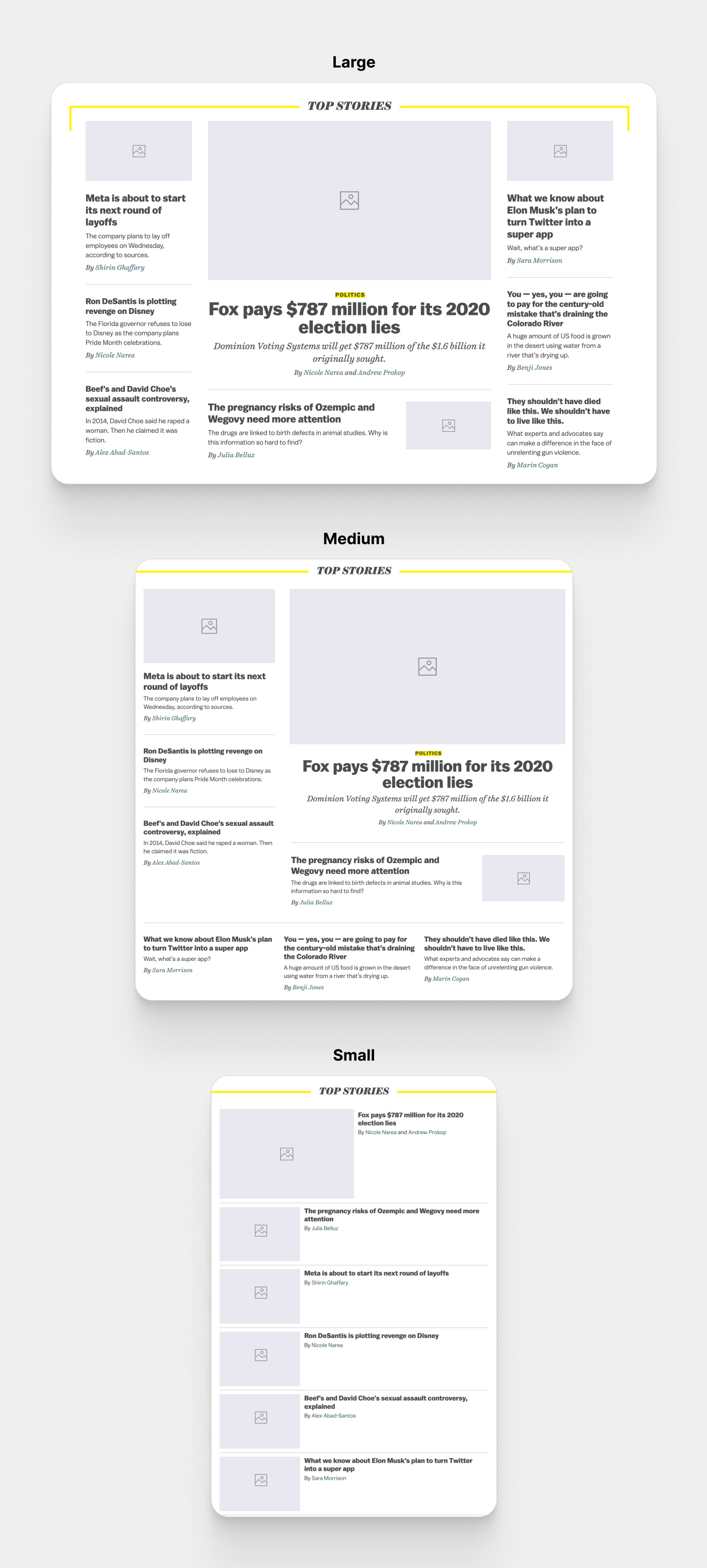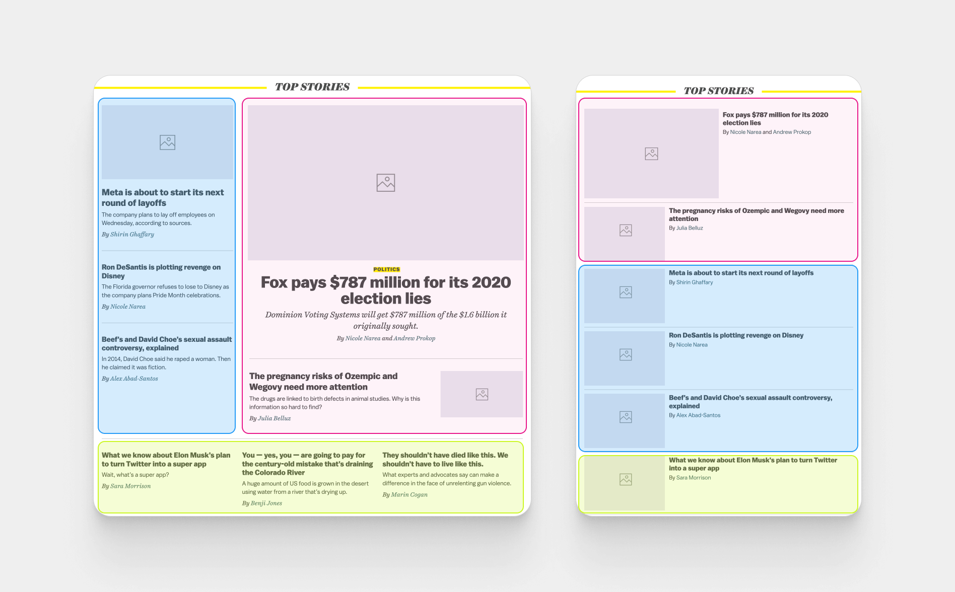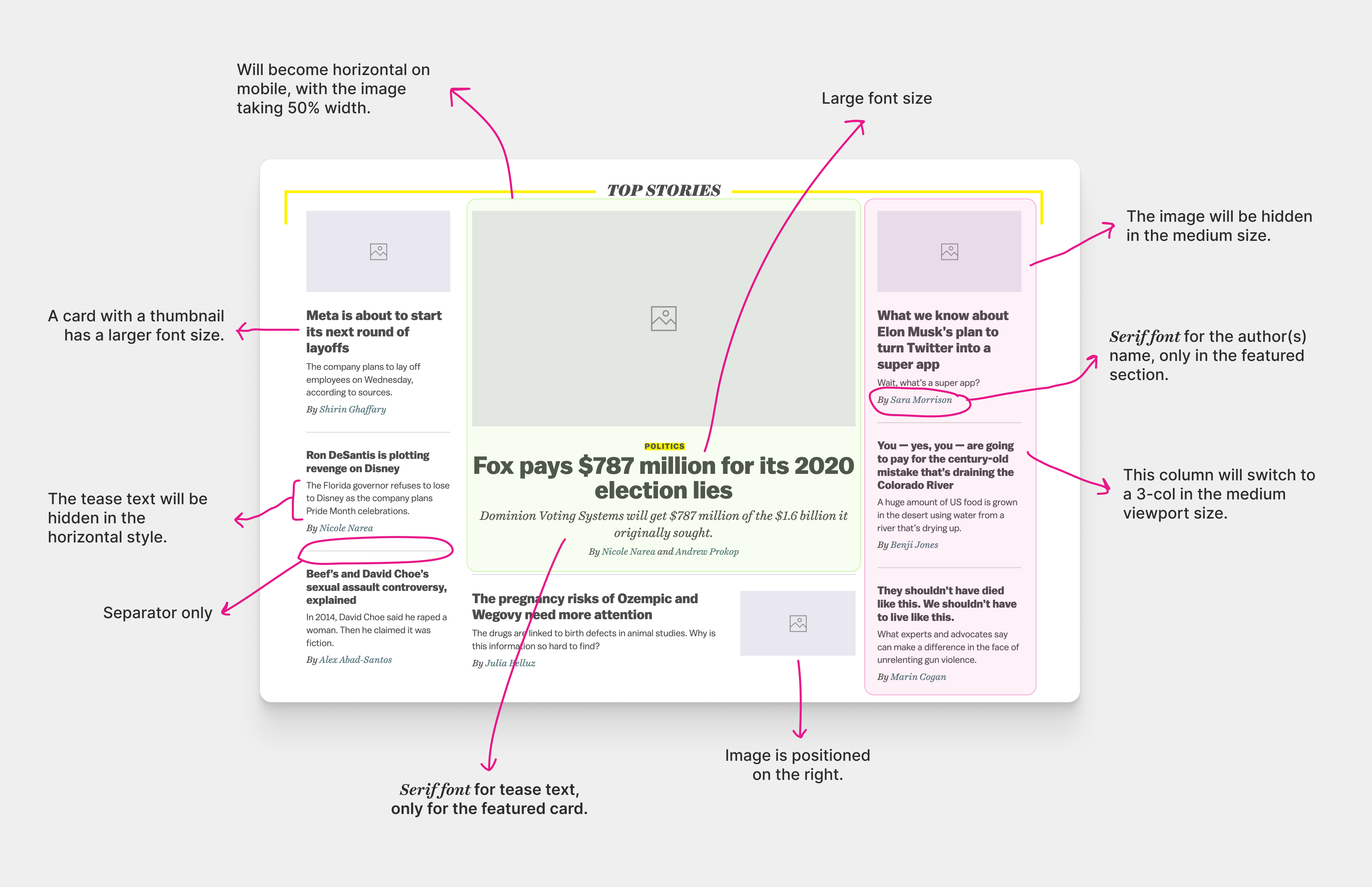 In vox.com, CSS flexbox is being used to handle the layout. I’m not a fan of using flexbox for such a purpose as this feels more like a CSS grid use case. I believe the Vox team used flexbox since it was better supported at the time of building the layout.
