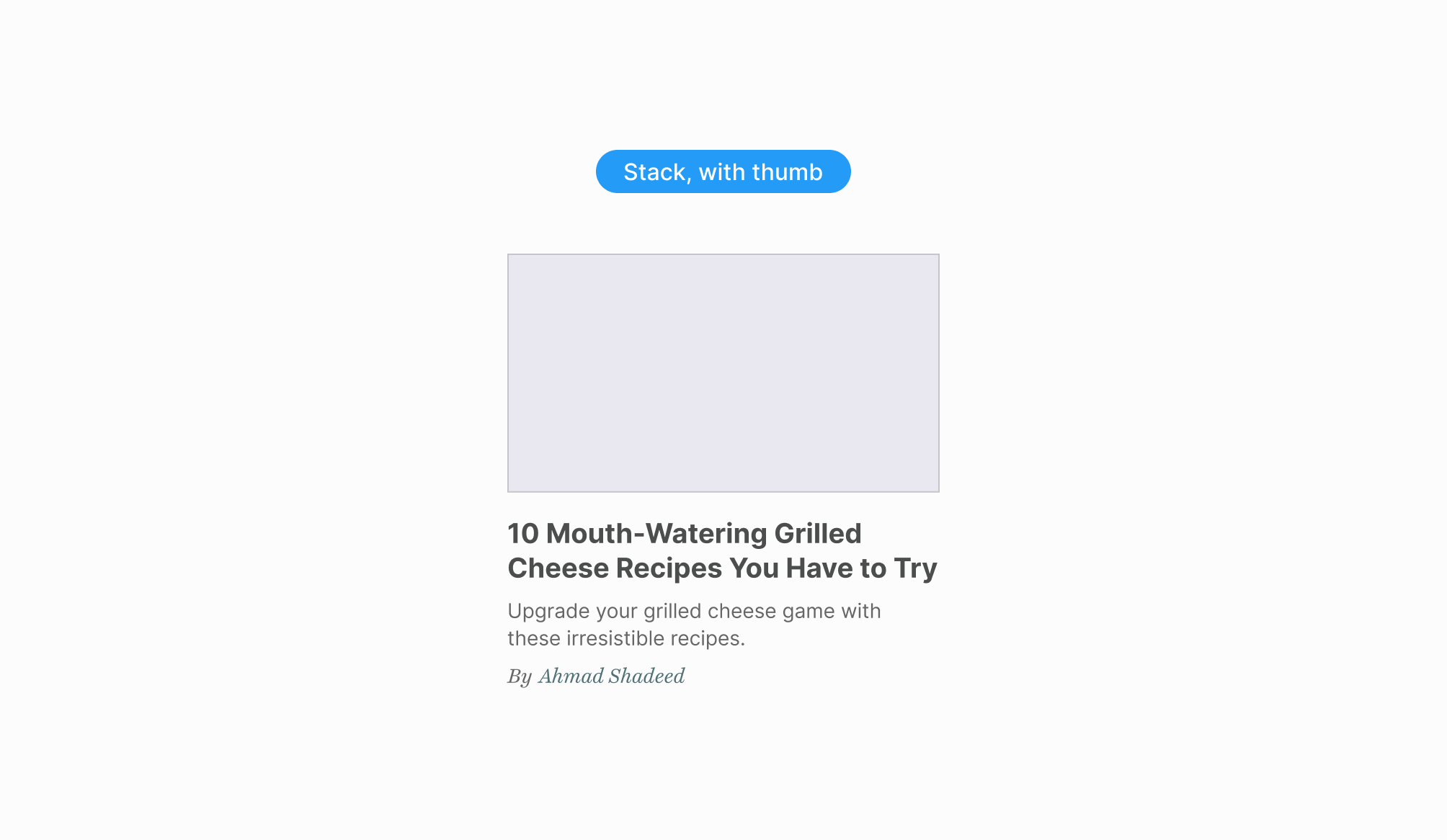 The featured card is displayed horizontally when the container width is small and will change to the stacked styles on larger sizes. In this case, the thumbnail becomes larger and takes 50% of the width.