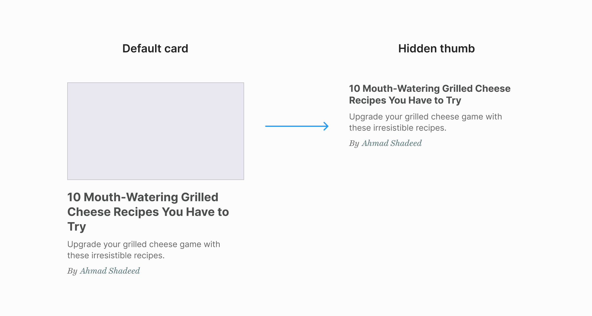 In this variation, the font size gets smaller. That happens when the image is hidden. At first, I thought about using CSS :has to check if the card thumb is displayed or not.
