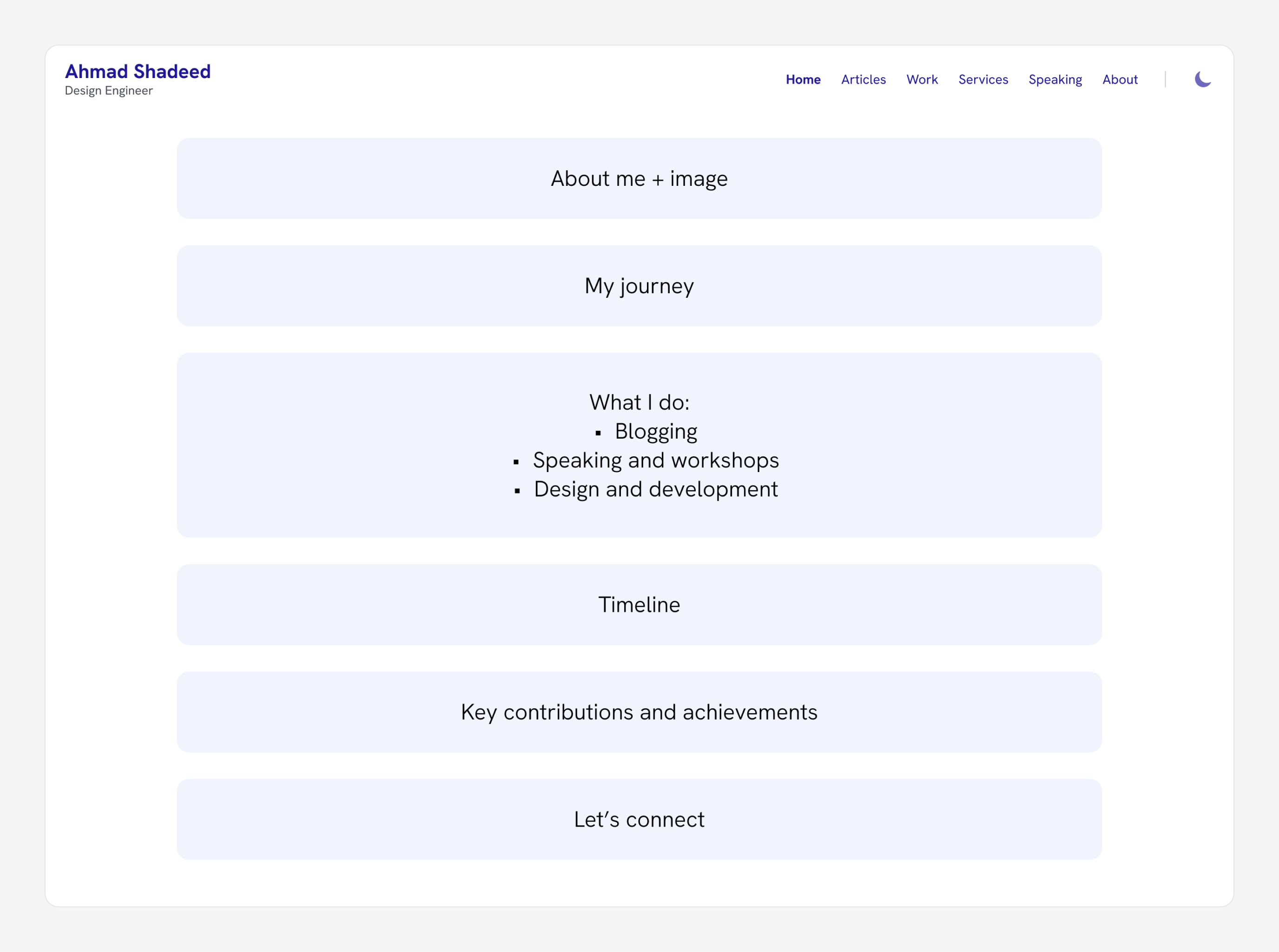 Given that this is a personal website, I didn’t have a branding or a clear logo that I used in the design. However, over the years, I used the blue color as my brand color. Based on that, I started exploring design ideas.