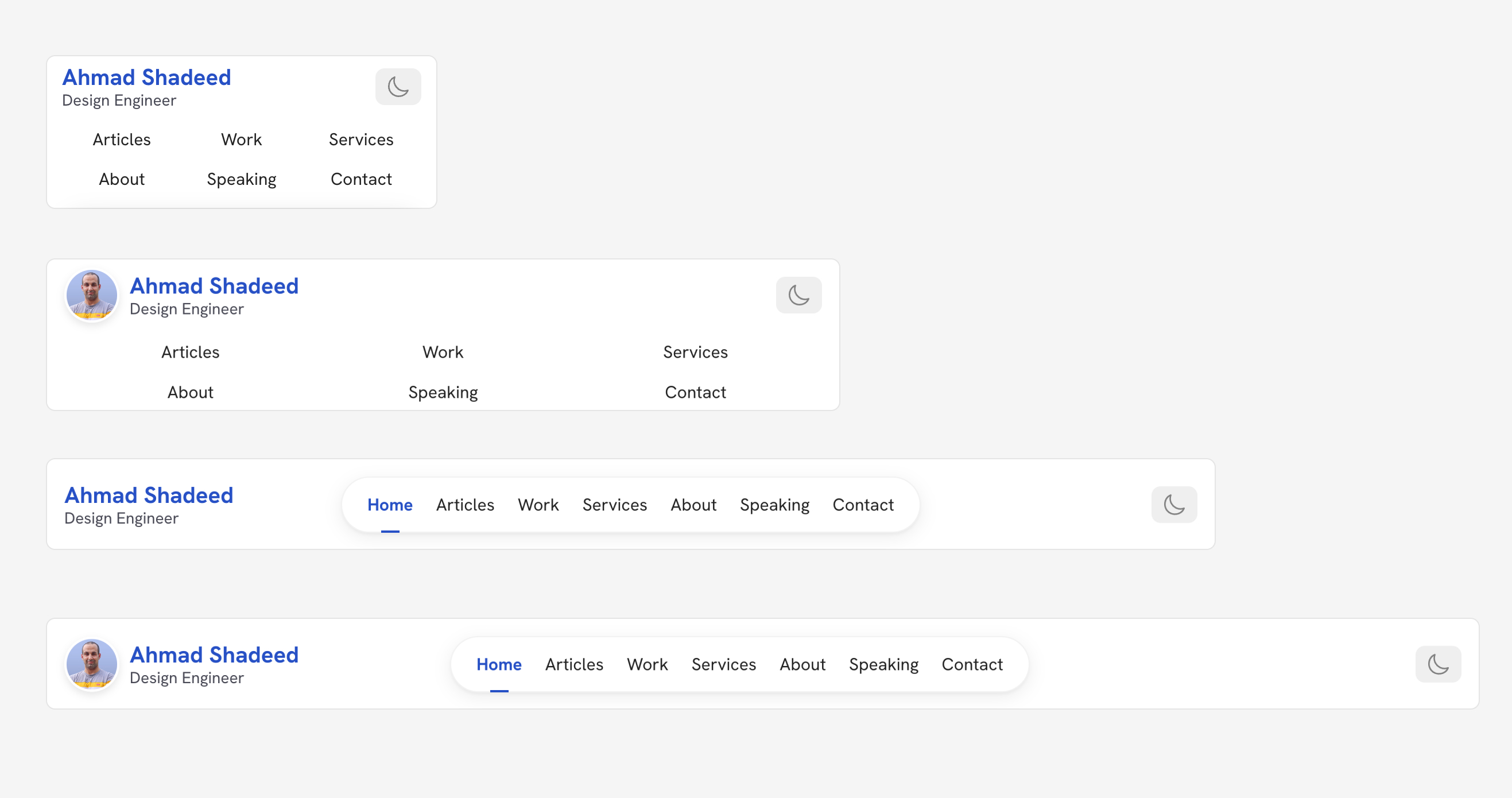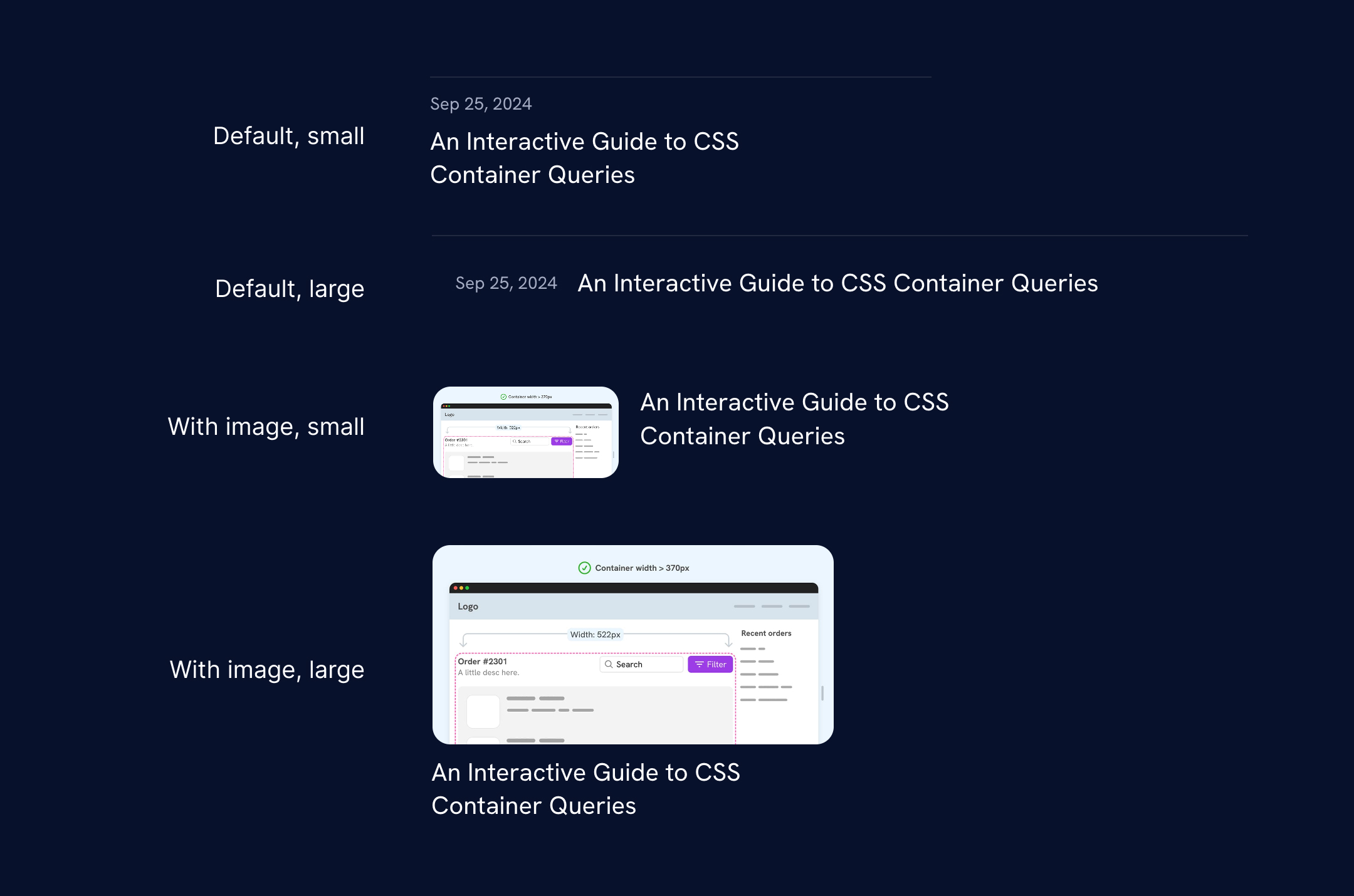 I used container queries for a couple of components in the design. Here are a few of them.