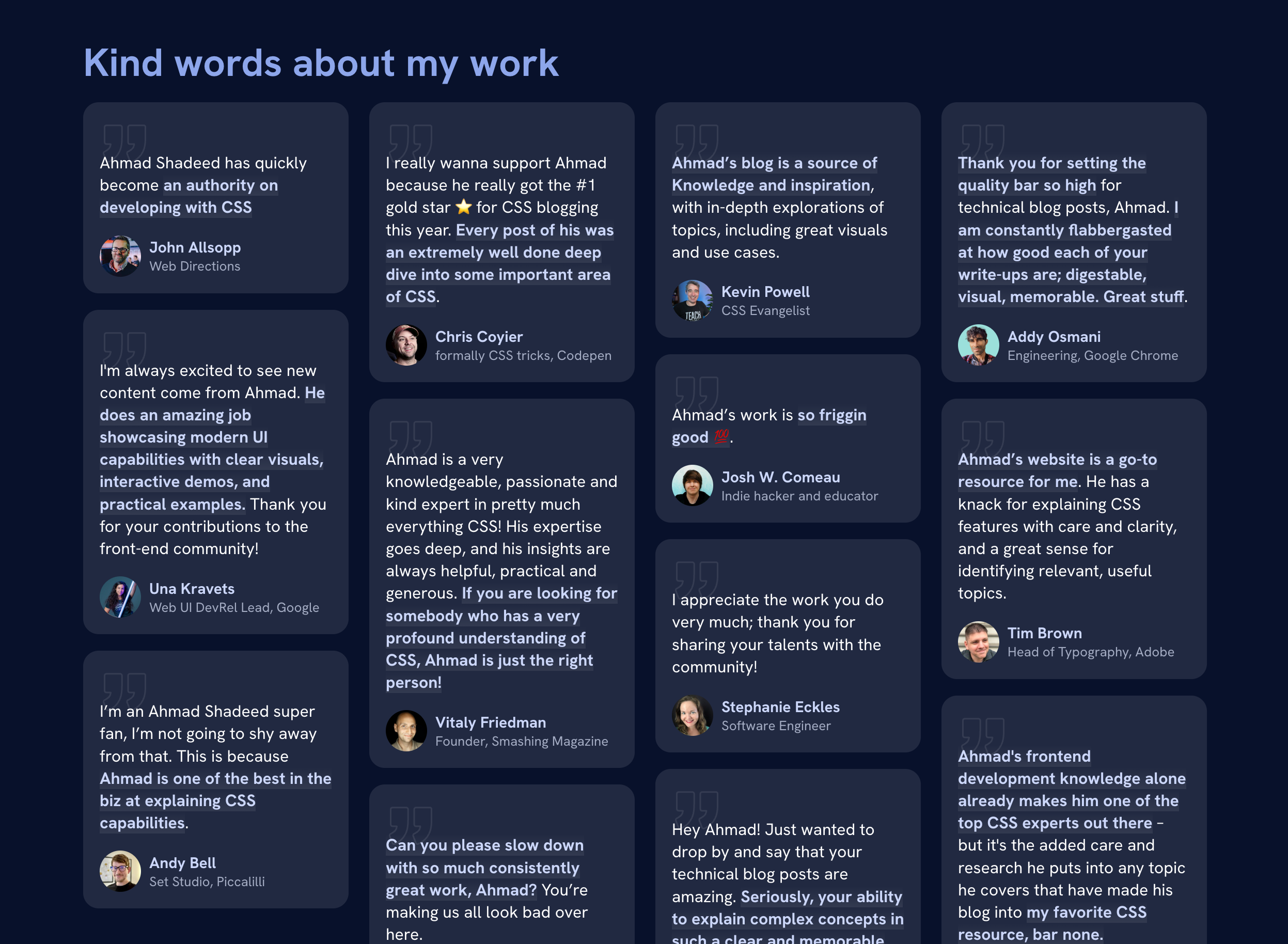I’m thankful enough that the new design received great feedback from the community. One feedback I want to highlight is the article Ahmad Shadeed has a nice new website by Andy Bell. Thank you, Andy!