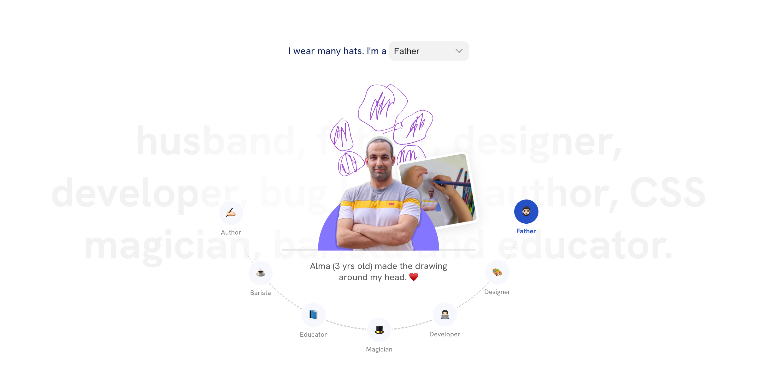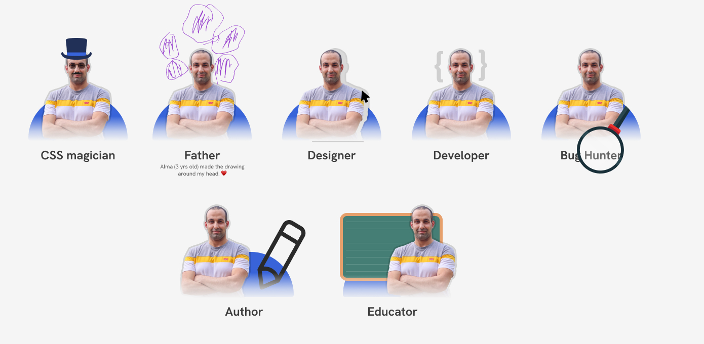 I thought about using my photo in a section where it represents how I wear many hats. Here is the initial design: