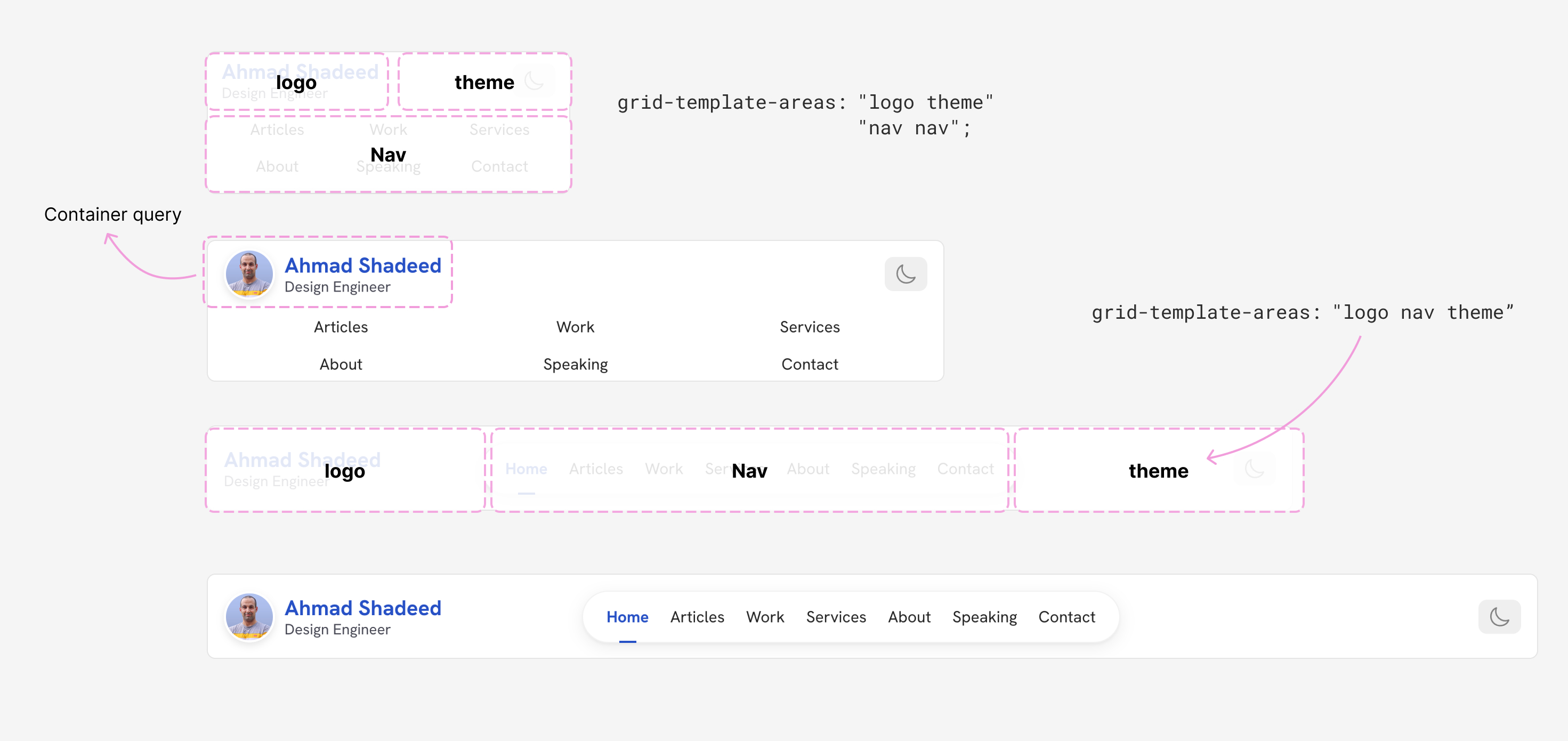 The header layout is built with a CSS grid. I used grid-template-areas to make it easier.