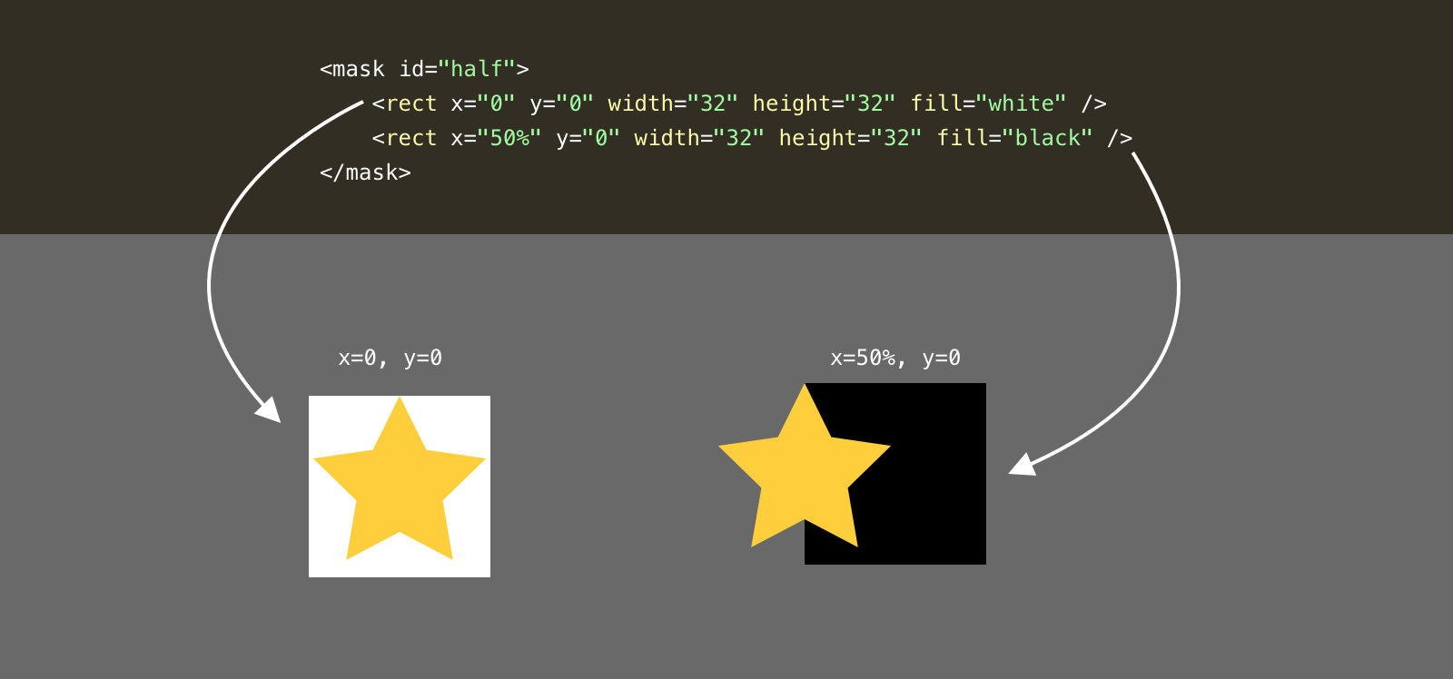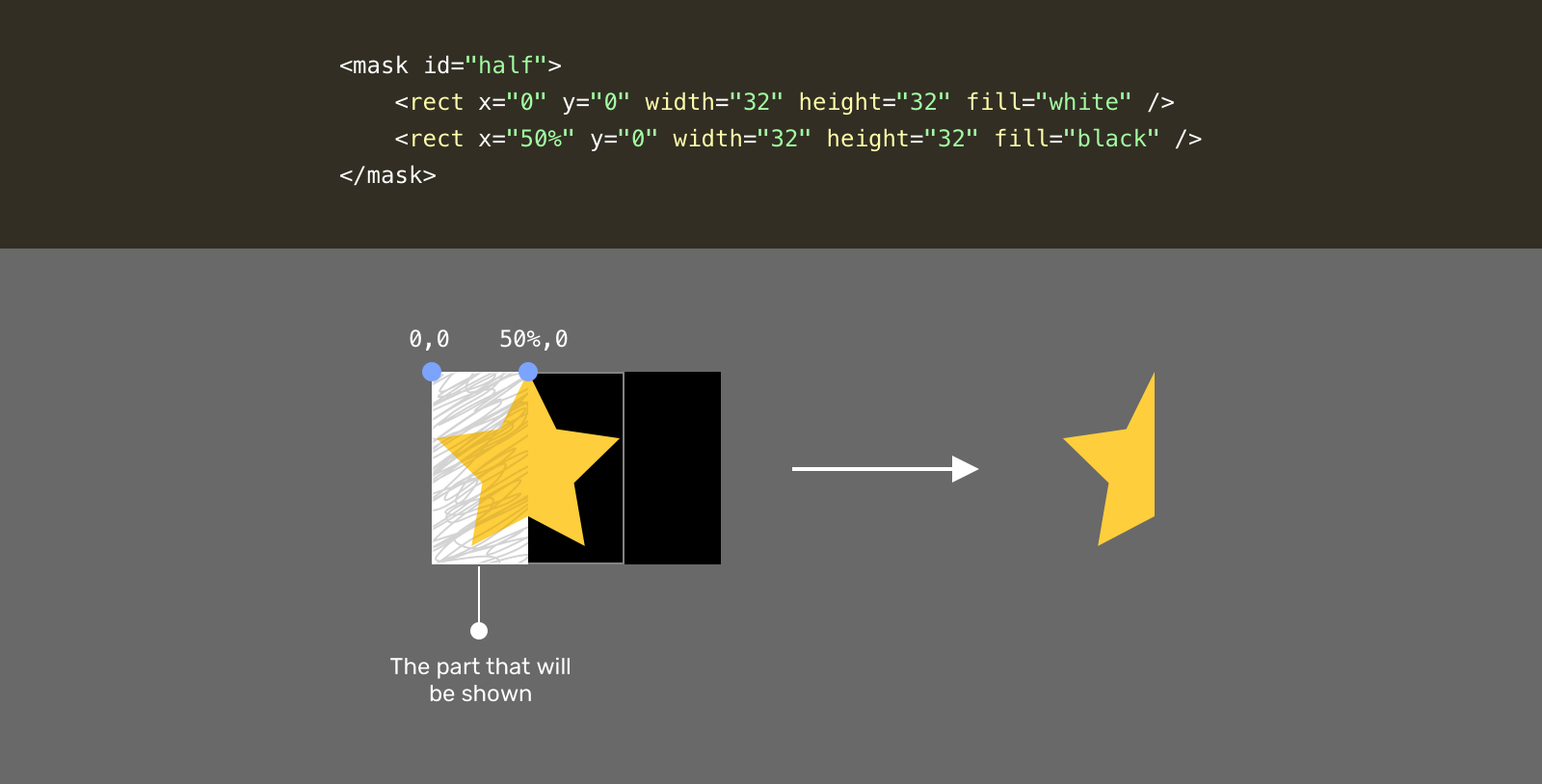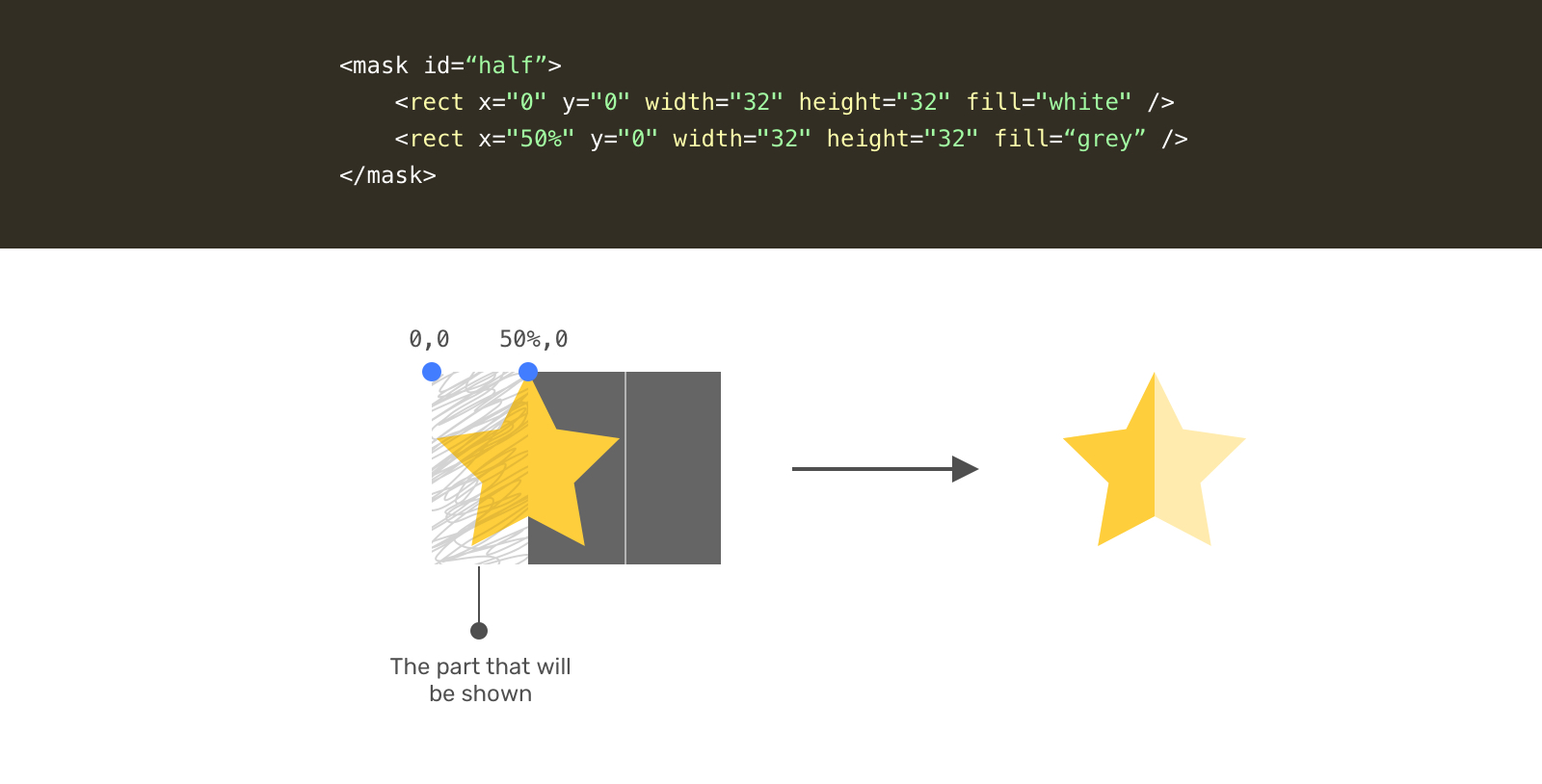 The goal of using masks is to emulate the effect of erasing a part of the star and painting the other part with a translucent color. To do that, we need the help of SVG masks.
