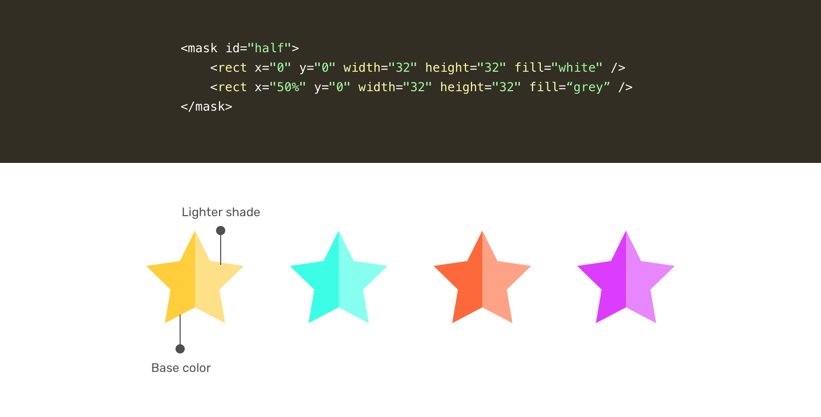 With that, we have a star with a partial fill. What’s awesome with that solution is that we don’t need to provide two shades of color. The mask will do the work.