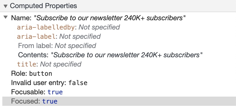 In the example below, we have a button with an icon, and I added an aria-hidden attribute for the icon so it can be hidden from the accessibility tree. I also added focusable=false to avoid the icon being focused in IE.