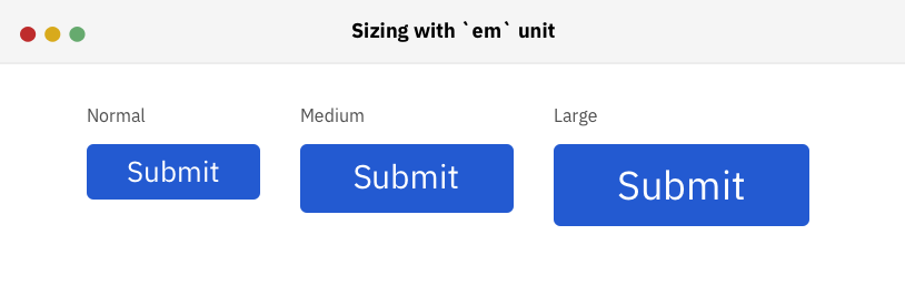 To size buttons properly, em units can be used for that purpose. They’re powerful and very helpful for that job. An em unit is equal to the font-size of the element (px or rem). Consider the below example: