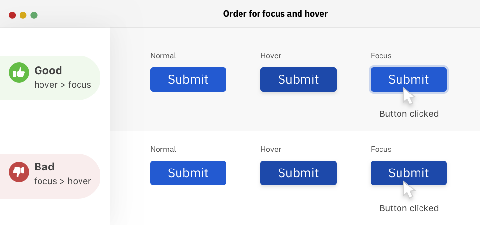 When the hover style is added before the focus one, each style works correctly. However, the issue lies in when focus is placed before hover. When the element is clicked with the mouse, the focus style won’t appear at all, and only the hover style will be visible.