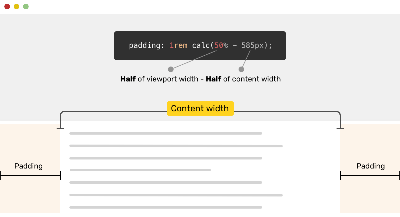 An alternative solution would be to use the new CSS max() function. Simply, we set a minimum padding of 1rem, and the 50% - 585px calculation can be used as the other value.