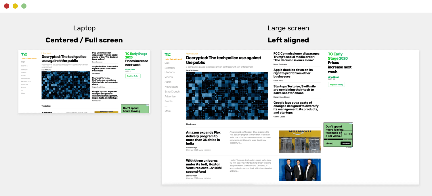 The Techcrunch website is an example of this. Notice how the website is left-aligned on large screens.