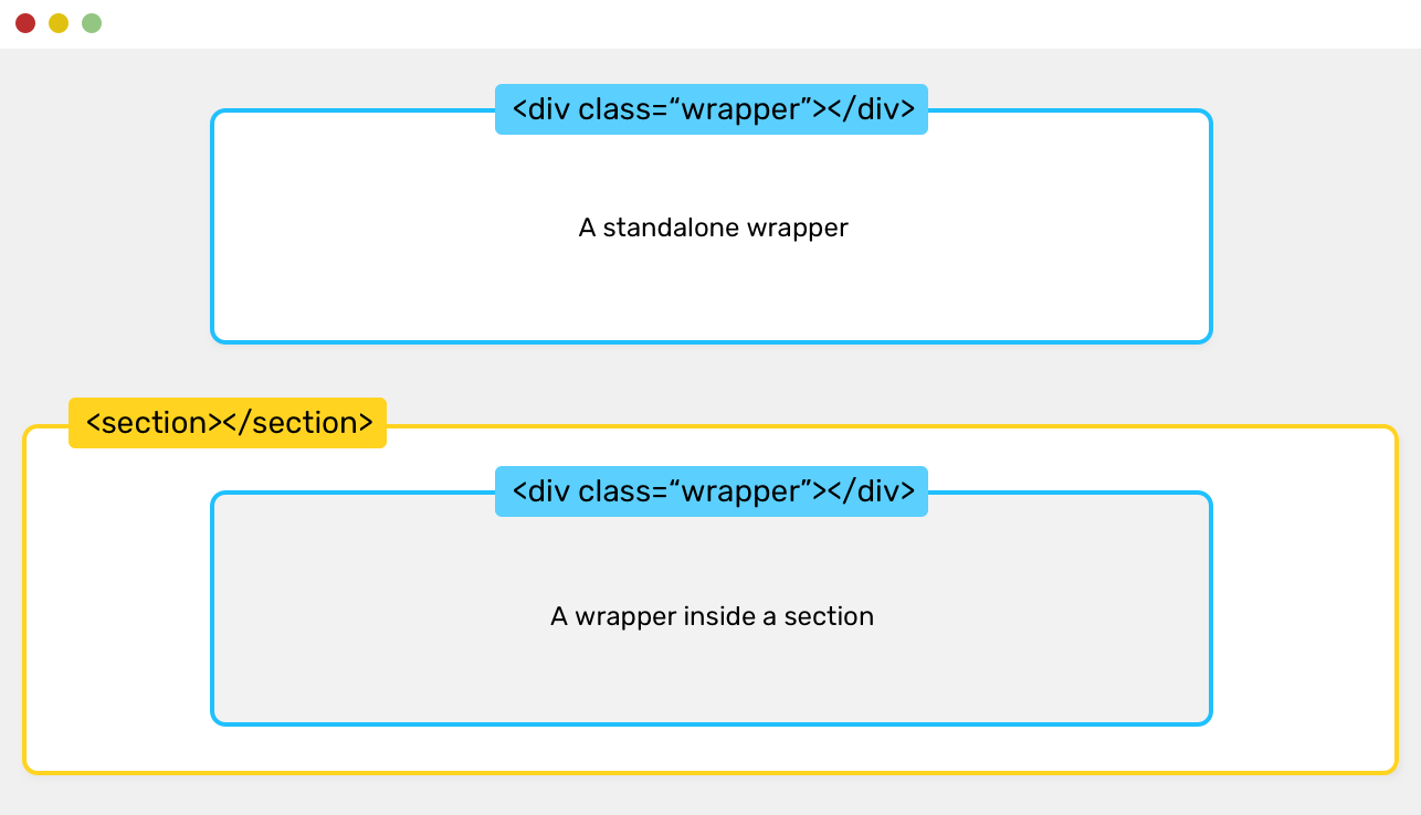 That way, the wrapper CSS stays as it is, and the spacing is added with an additional CSS utility class. Now, you might ask, why do I need to add multiple wrappers to a page, when I can add one? In the HTML above, there is a <section> element between two wrappers.