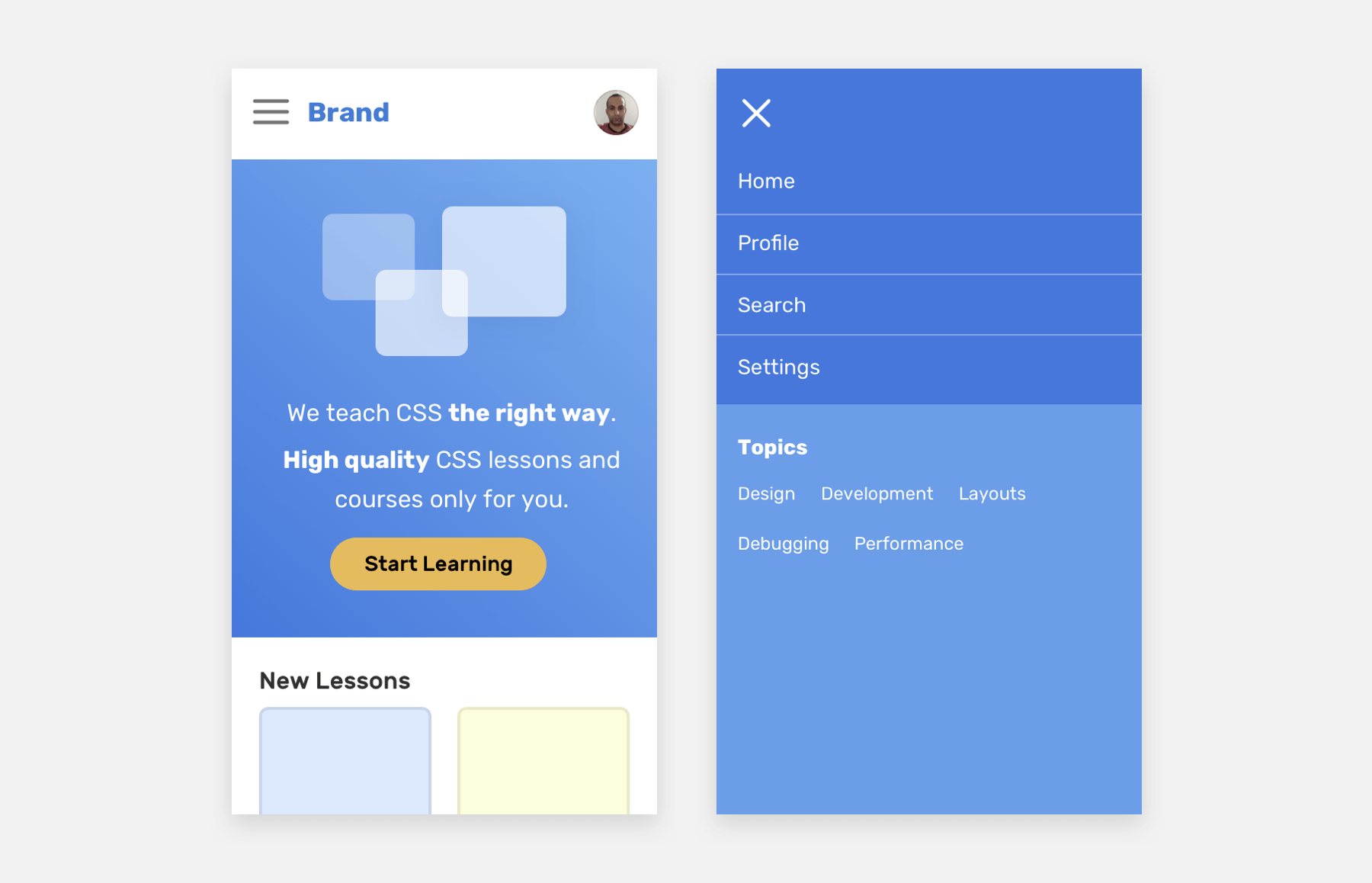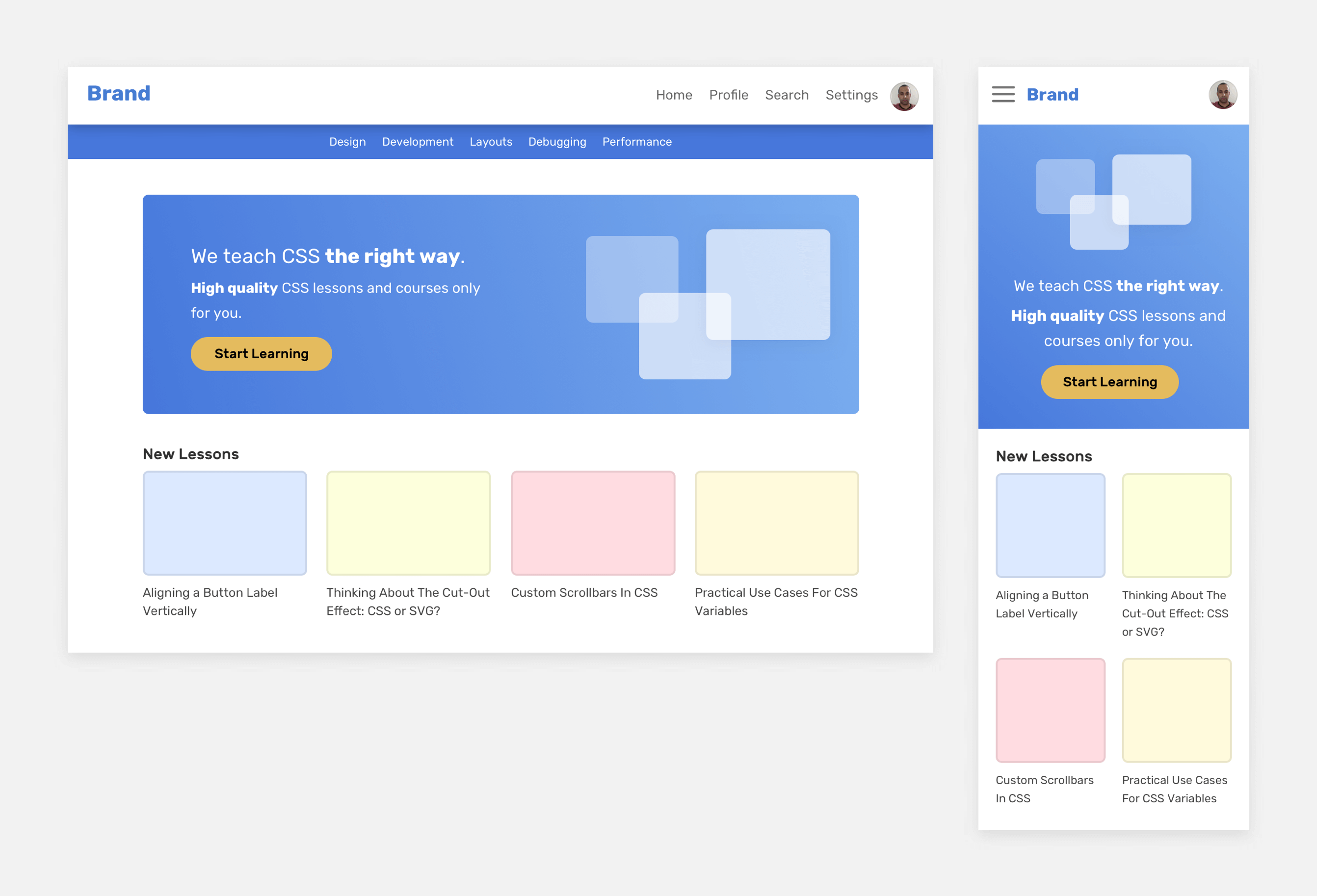 The components that have a lot of differences on mobile versus desktop are the header and navigation. The rest have some slight differences. For the header, we can use a mix of min-width and max-width media queries to scope each design for its desired viewport size.