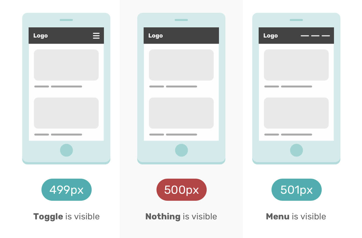 These media queries might look good to you. However, 99% of the time, you’ll forget to test an important breakpoint: 500px, that 1-pixel gap between the two breakpoints. At this breakpoint, neither the navigation nor the toggle would be visible.