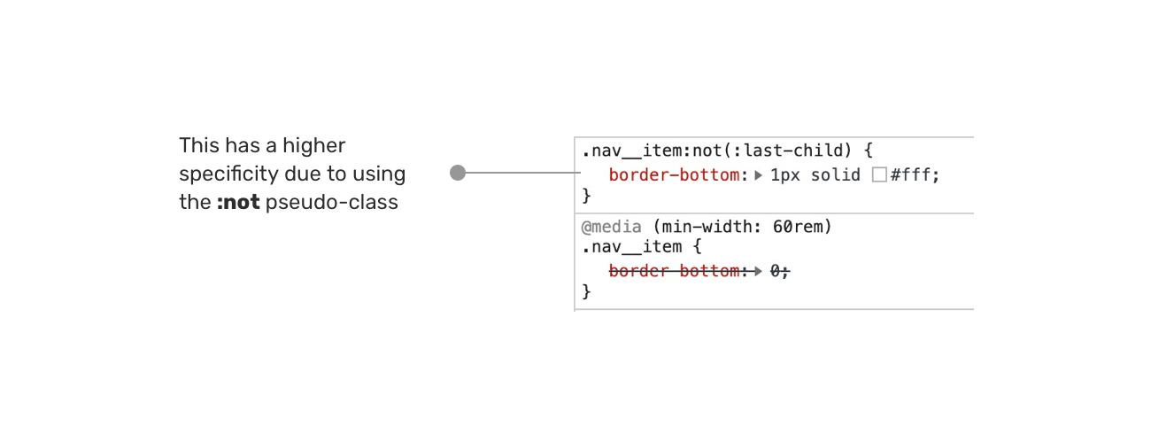 Not only that, but this might cause CSS specificity issues as well. Suppose that a developer wants to remove the border-bottom from the .nav__item by using the following CSS.