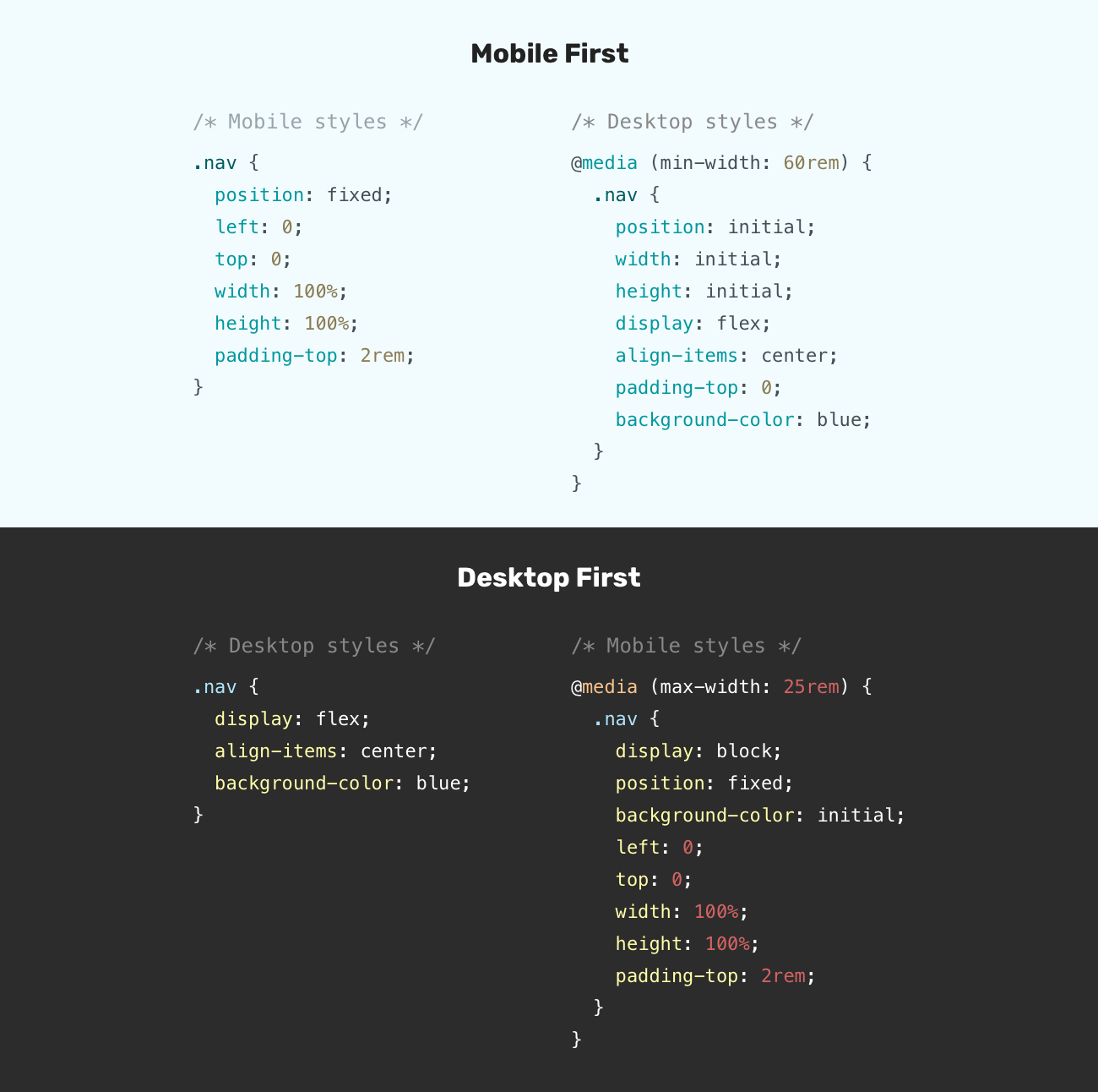 The term Mobile-First means that when developing a website, we start writing the CSS for smaller viewport sizes first, and then use CSS media queries to alter the experience for larger ones (e.g: tablets or desktops).