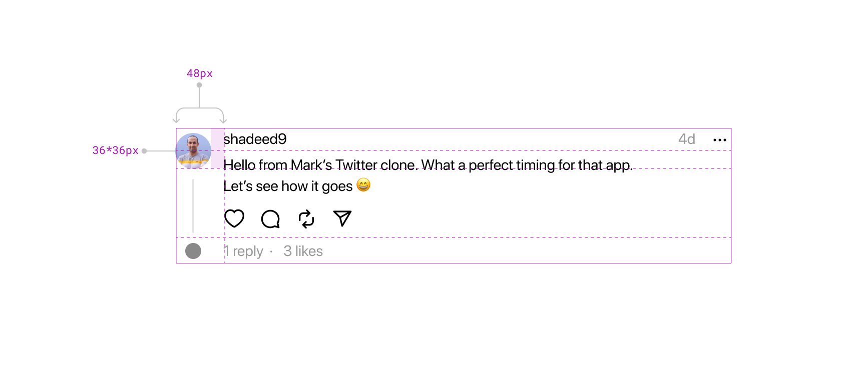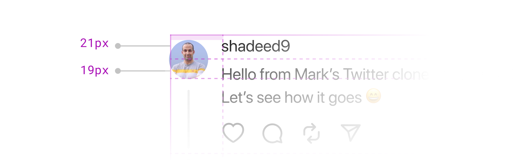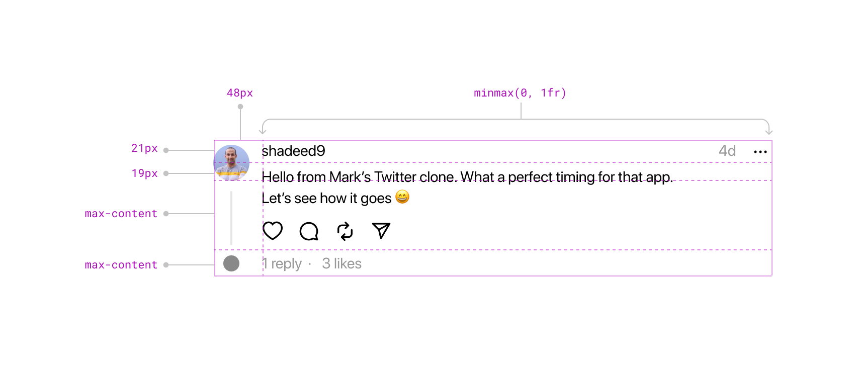 The avatar is positioned in the first column and spans the first two rows. It’s worth noting the presence of padding-top. Although I couldn’t find a specific reason for it in the production code, it seems to be fine-tuning the UI alignment.