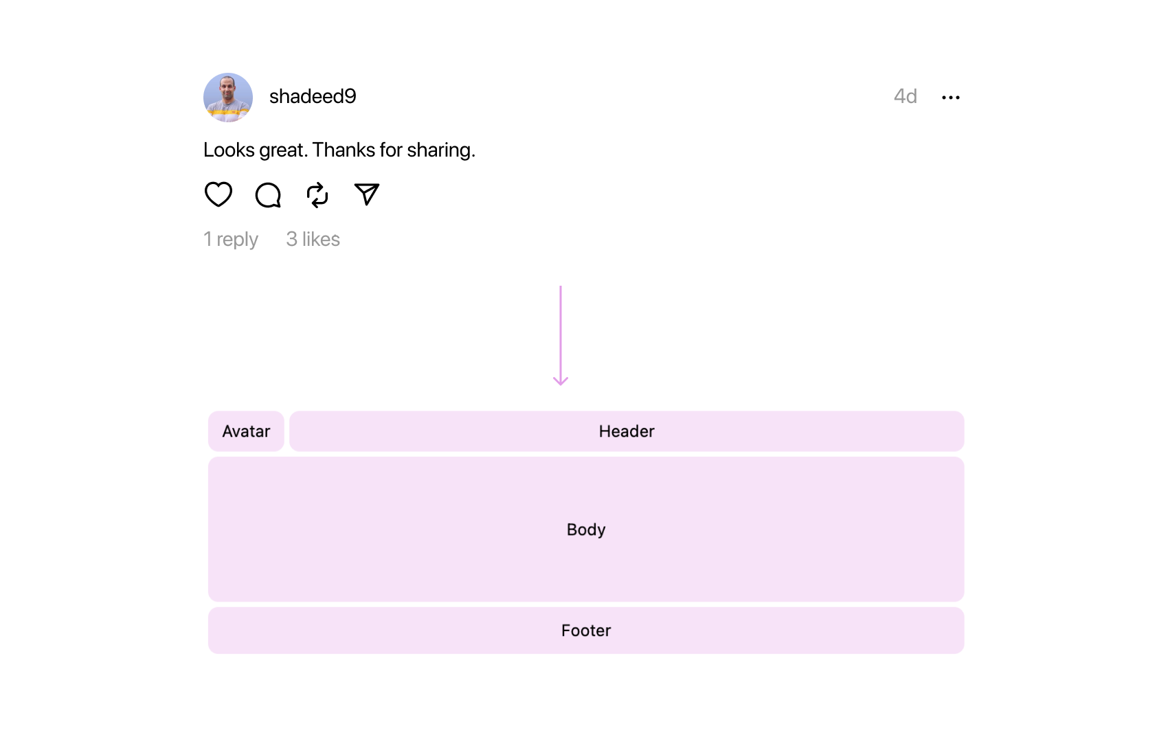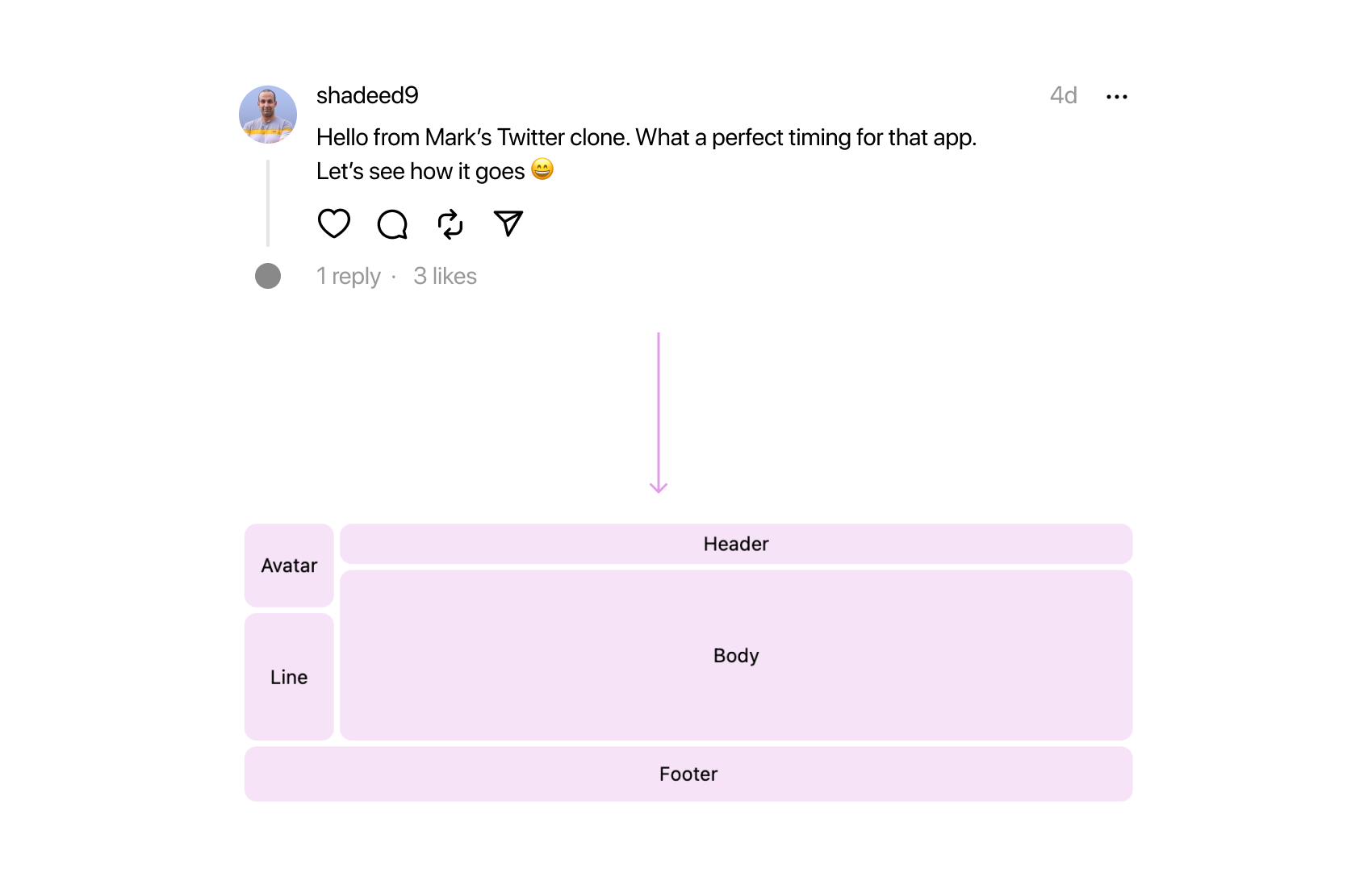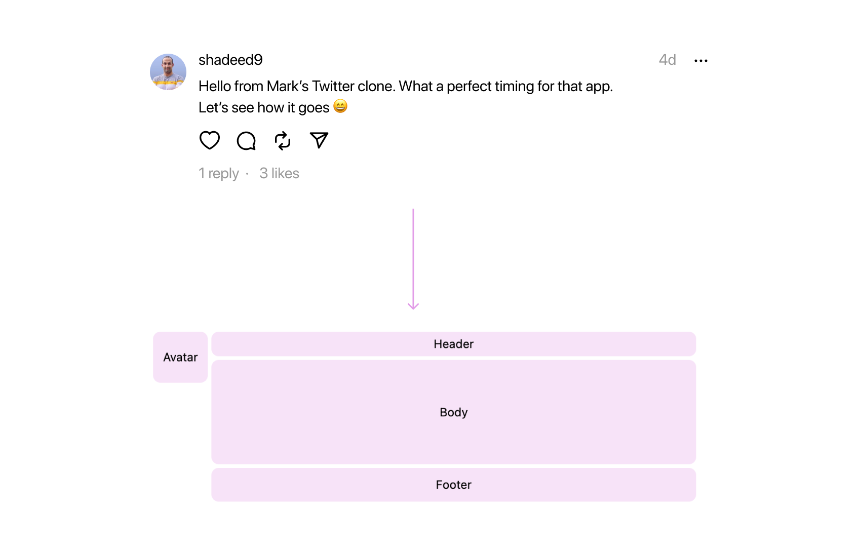The avatar is positioned in the first column and spans the first two rows. It’s worth noting the presence of padding-top. Although I couldn’t find a specific reason for it in the production code, it seems to be fine-tuning the UI alignment.