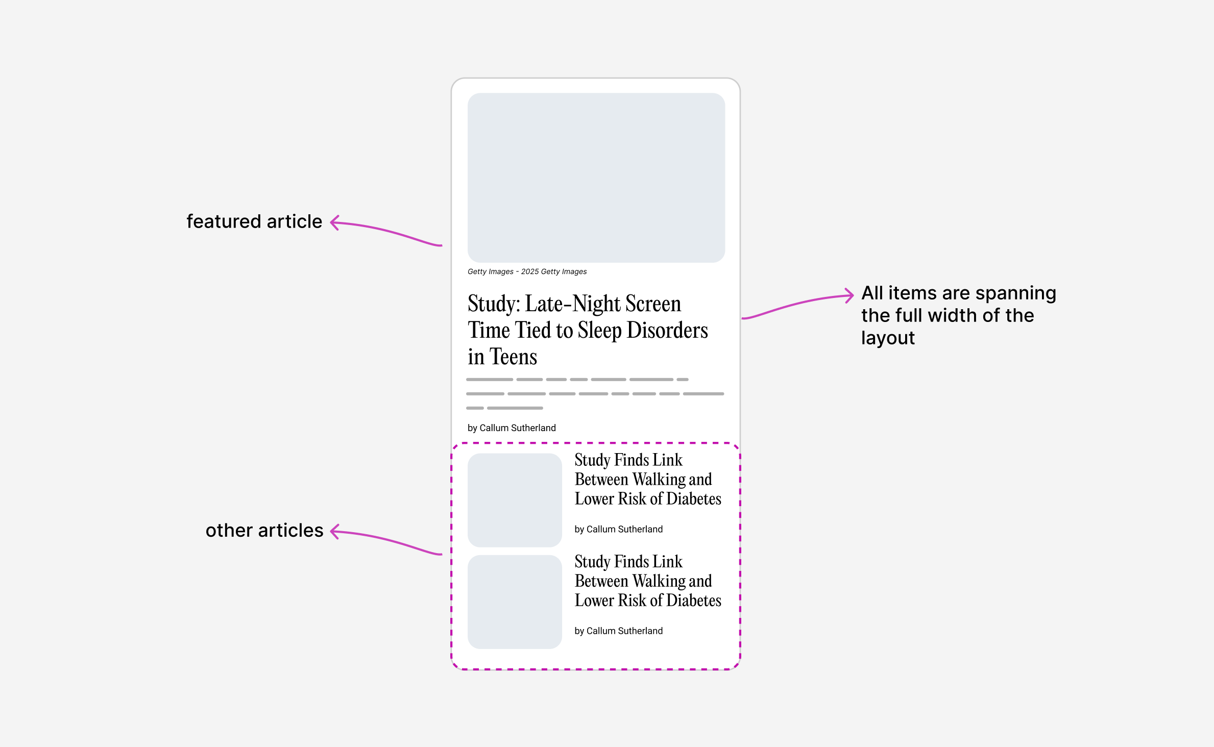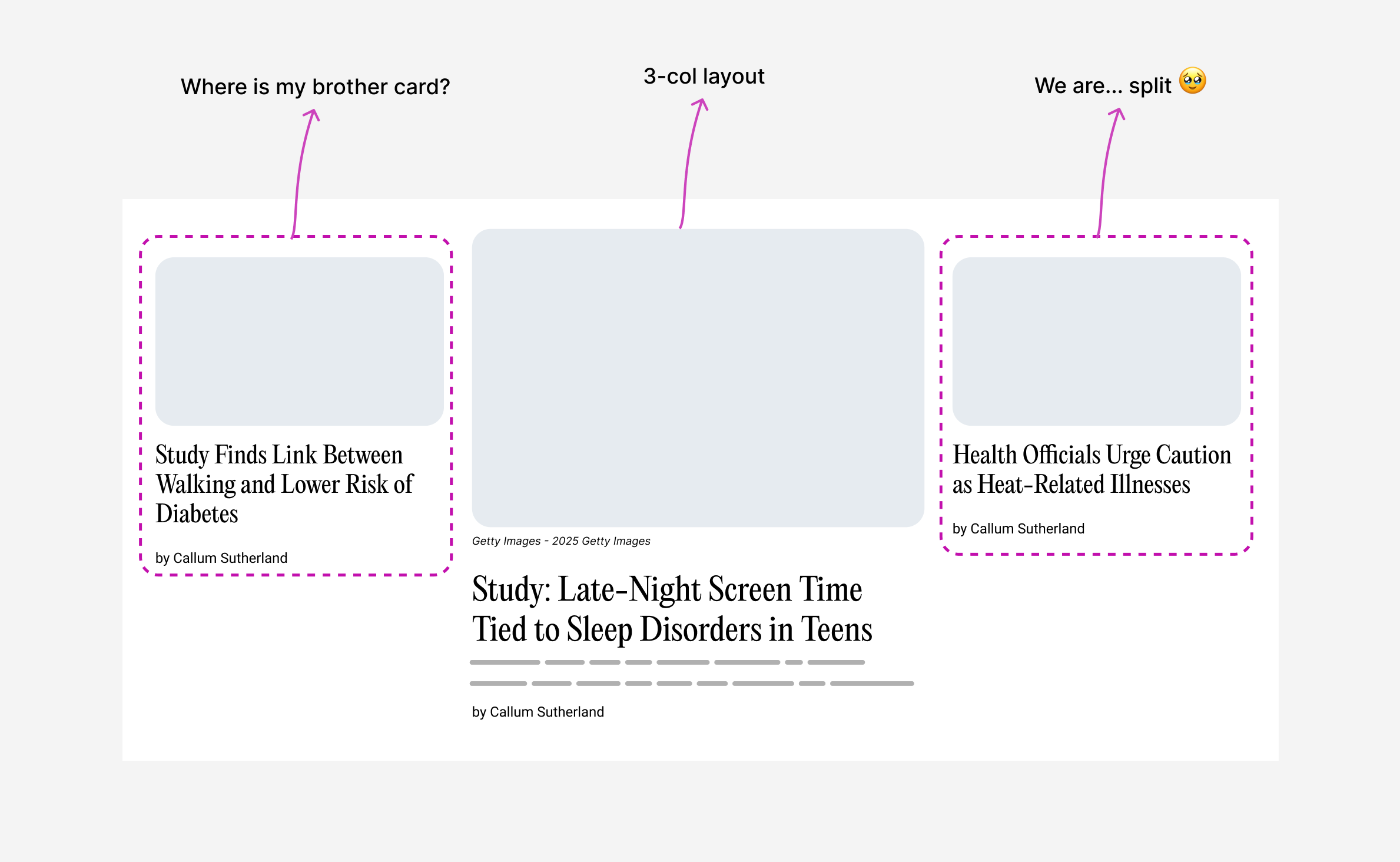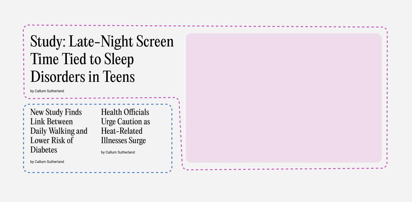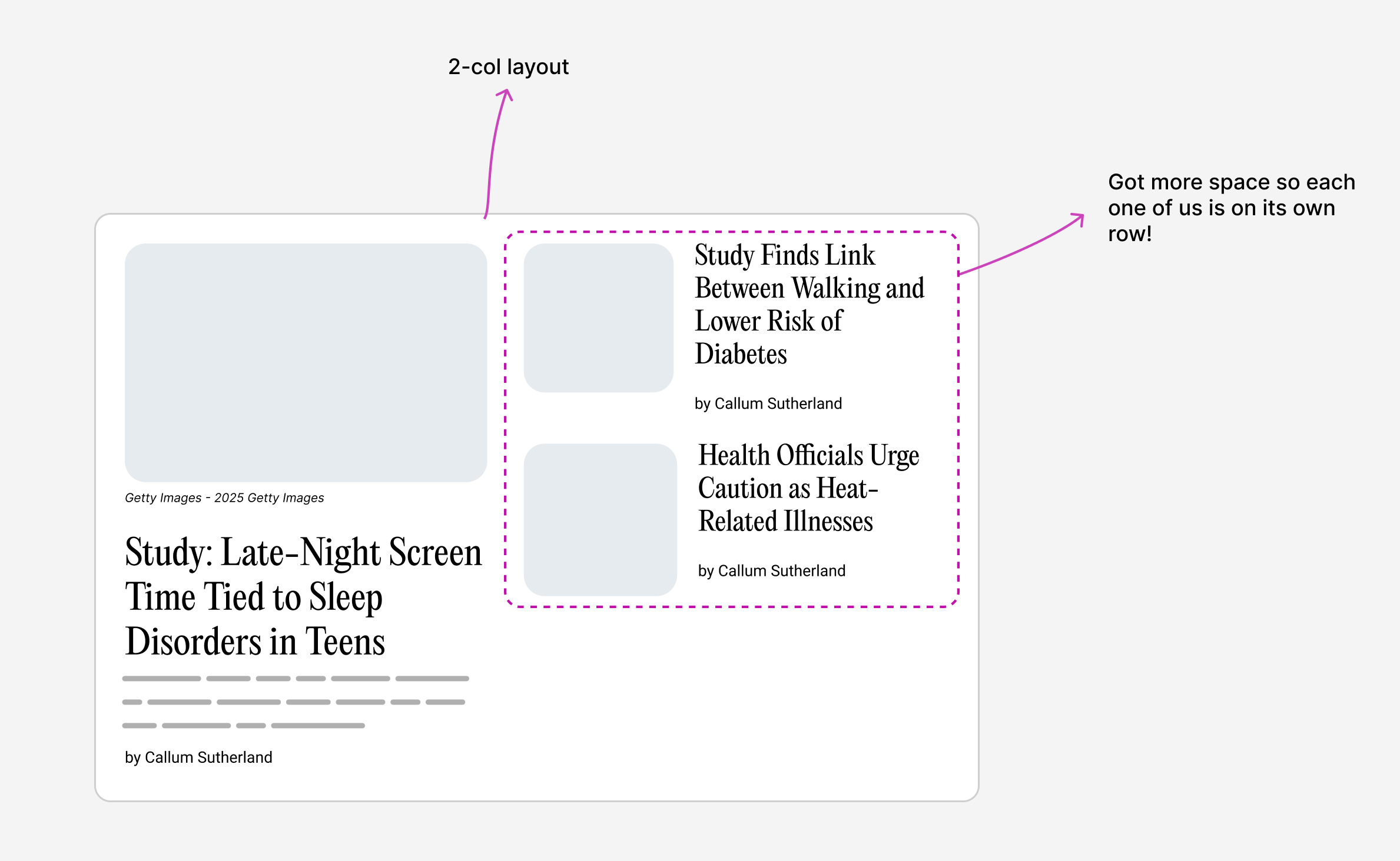 We now have more space, so the 2-col grid works. The other articles span a row each.