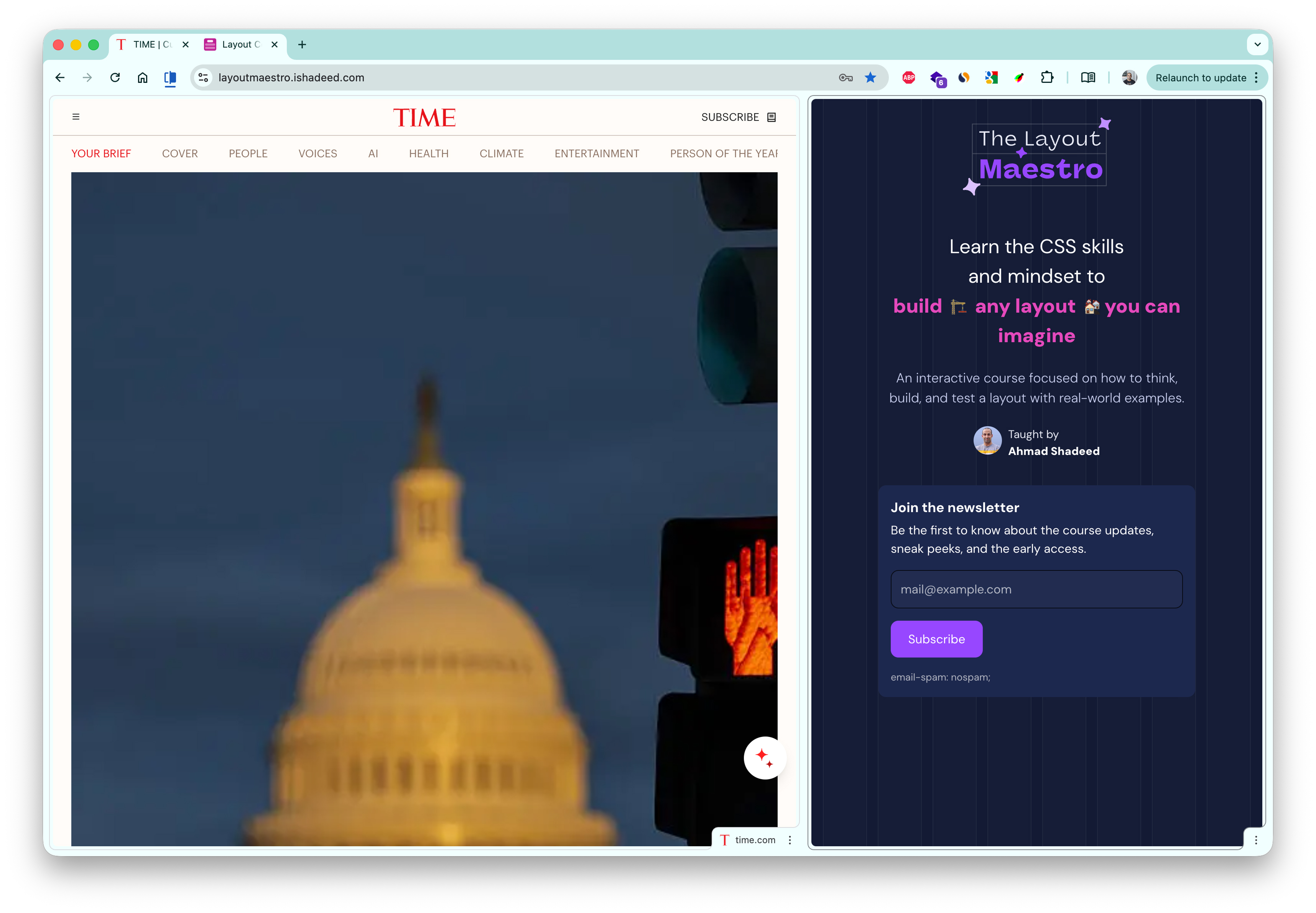 Here is an example of how I would build the Time.com hero section layout.