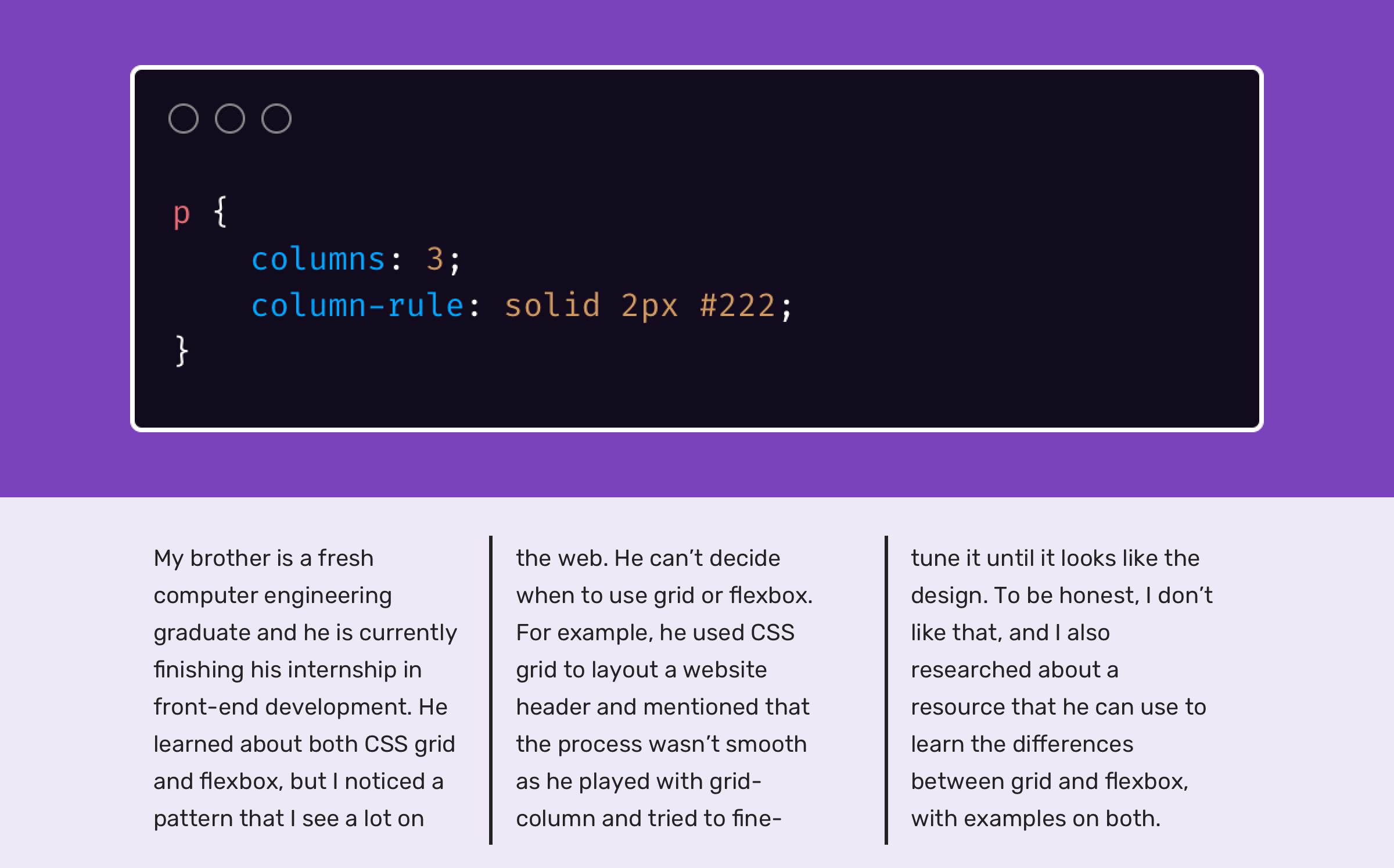 CSS columns is a layout method which can divide an element into columns. A common use-case for it is to divide a paragraph text content into two lines. However, the less common thing about it is that we can add borders between the columns. I learned about this tip from Manuel Matuzovic’s article.