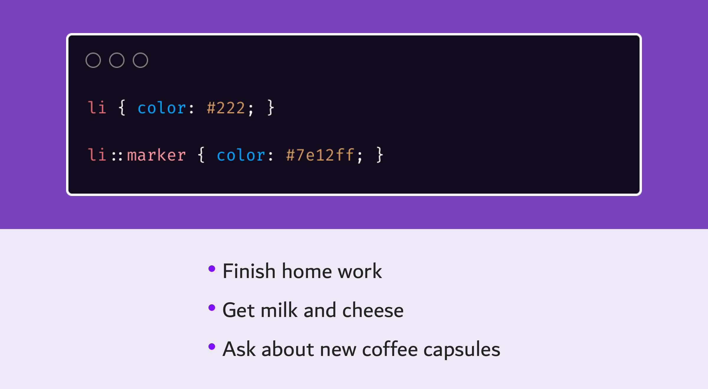 First, let me be clear that I wasn’t aware that the little default circle next to each list item is called a marker. Before I know about the ::marker pseudo-element, the process was to reset the list style, and then to add the circle as a ::before or ::after pseudo-elements. That’s isn’t practical. Here is the bad way of doing this: